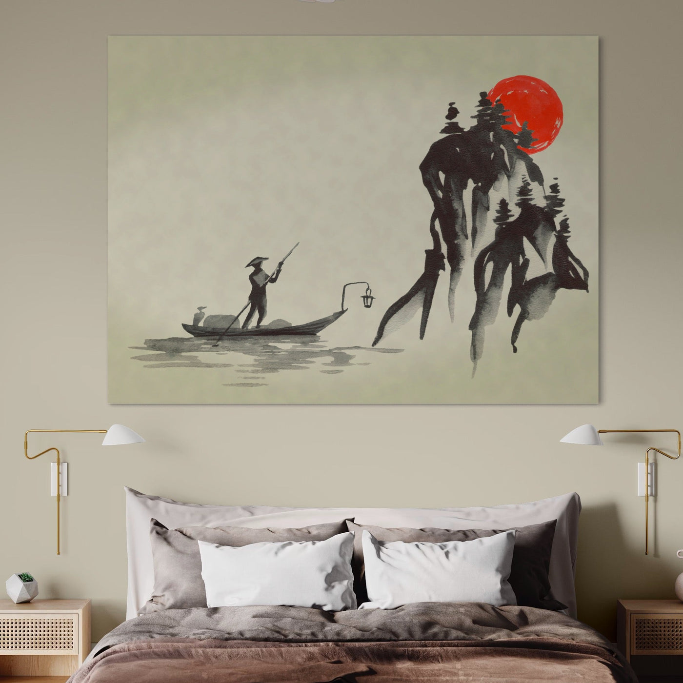 Tablou Canvas Premium LuxCanva® A1272, Japan Traditional Sumi, Living, Sakura, Barca, Apa, Dormitor, Culori Vibrante - 45 X 60