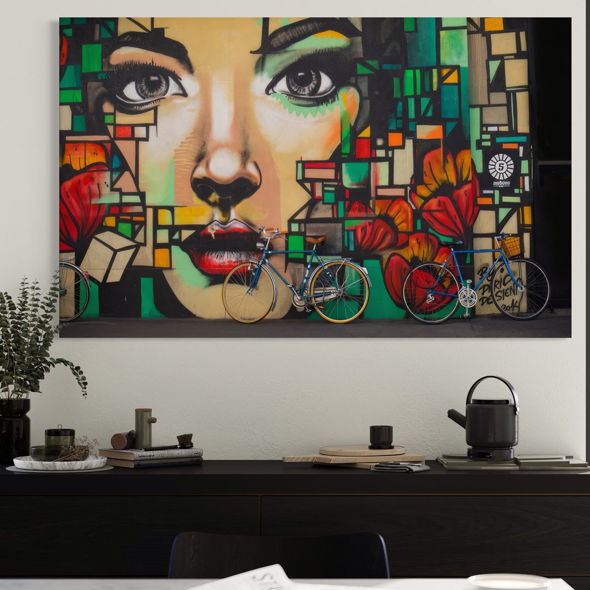 Tablou Canvas Premium LuxCanva® A1332, Graffiti Wall Art , Camera Copil, Biciclete, Arta Stradala, Femeie, Studio, Culori Vibrante