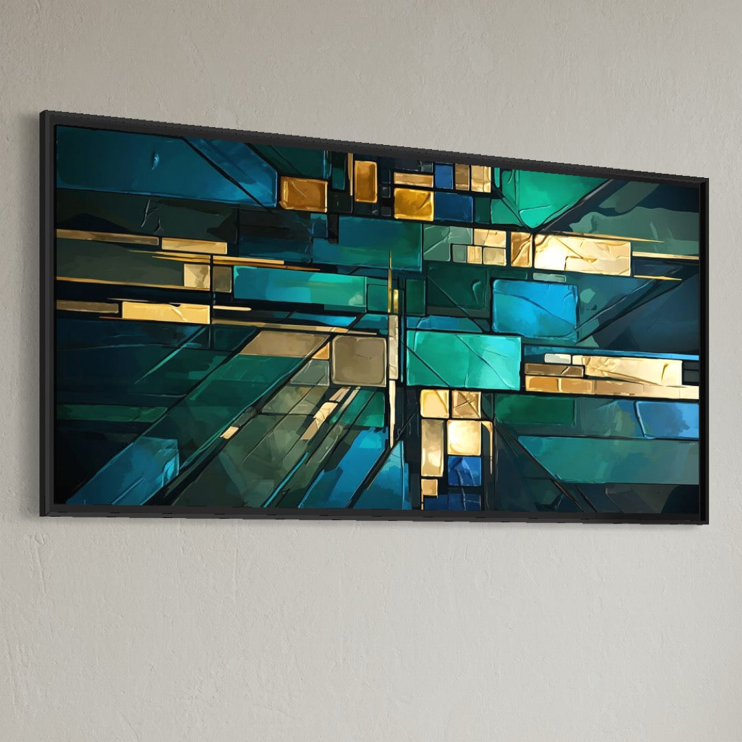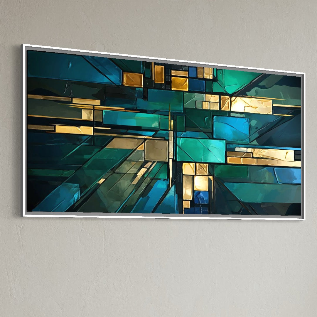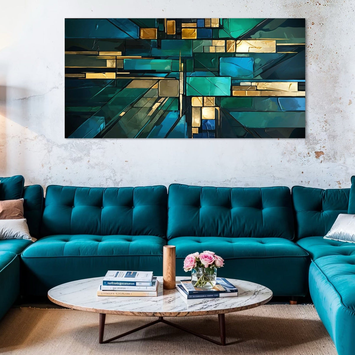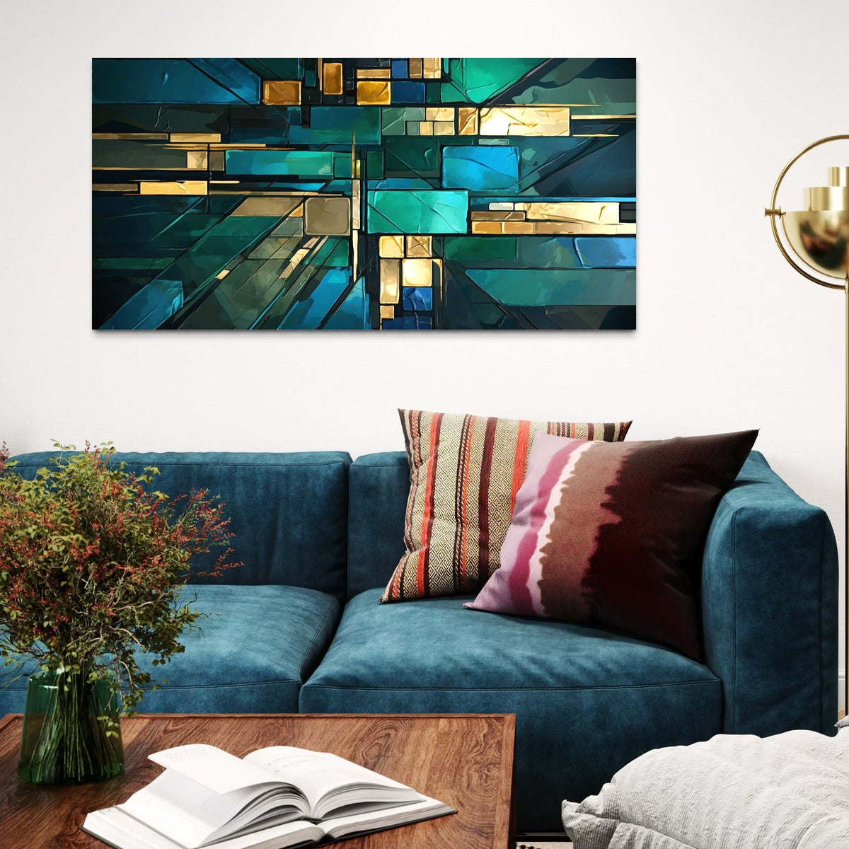 Tablou Canvas Premium, LuxCanva® C1282, Intre adanc si lumina, Geometrie, Culori, Abstract, Cartografiere, Albastru, Ocean, Smarald, Verde, Spatiu, Constructie, Expozitie, Birou, Living, Dormitor - 50 X 100