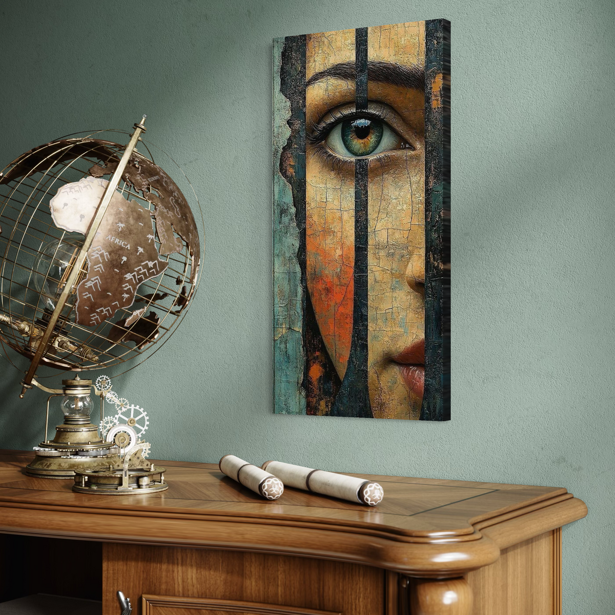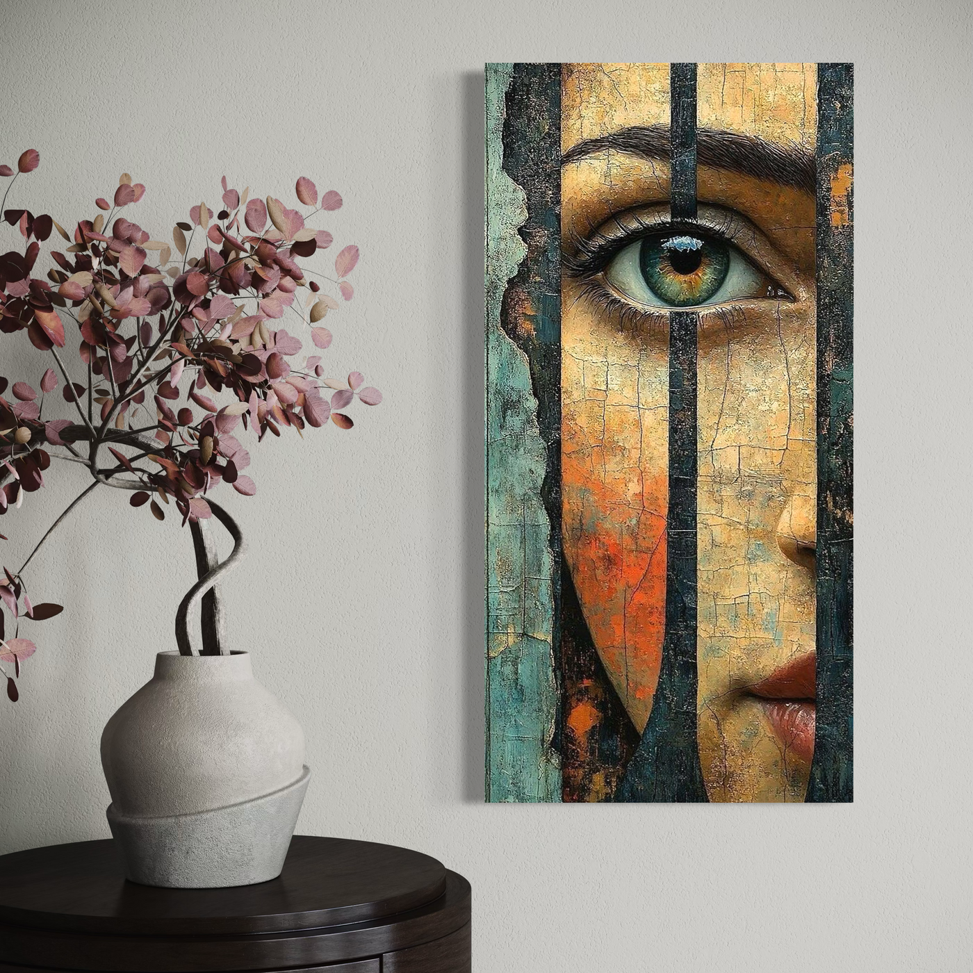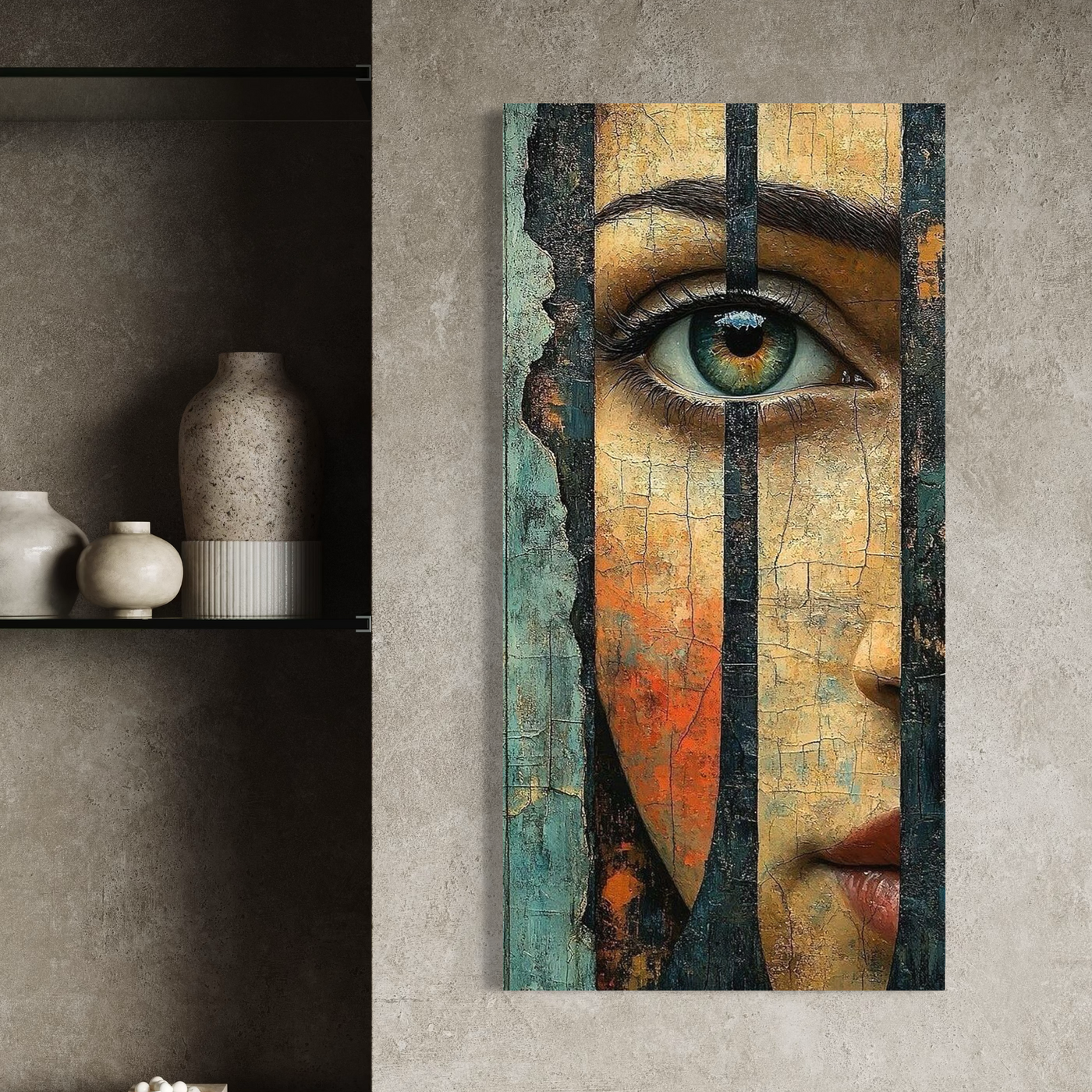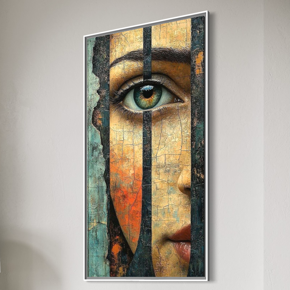 Tablou Canvas Premium, LuxCanva® C1300, Privirea dintre ziduri, Geometrie, Culori, Abstract, Auriu, Portret, Ochi, Gratii, Privire, Fereastra, Identitate, Fragmentat, Visare, Birou, Living, Dormitor - 50 X 100