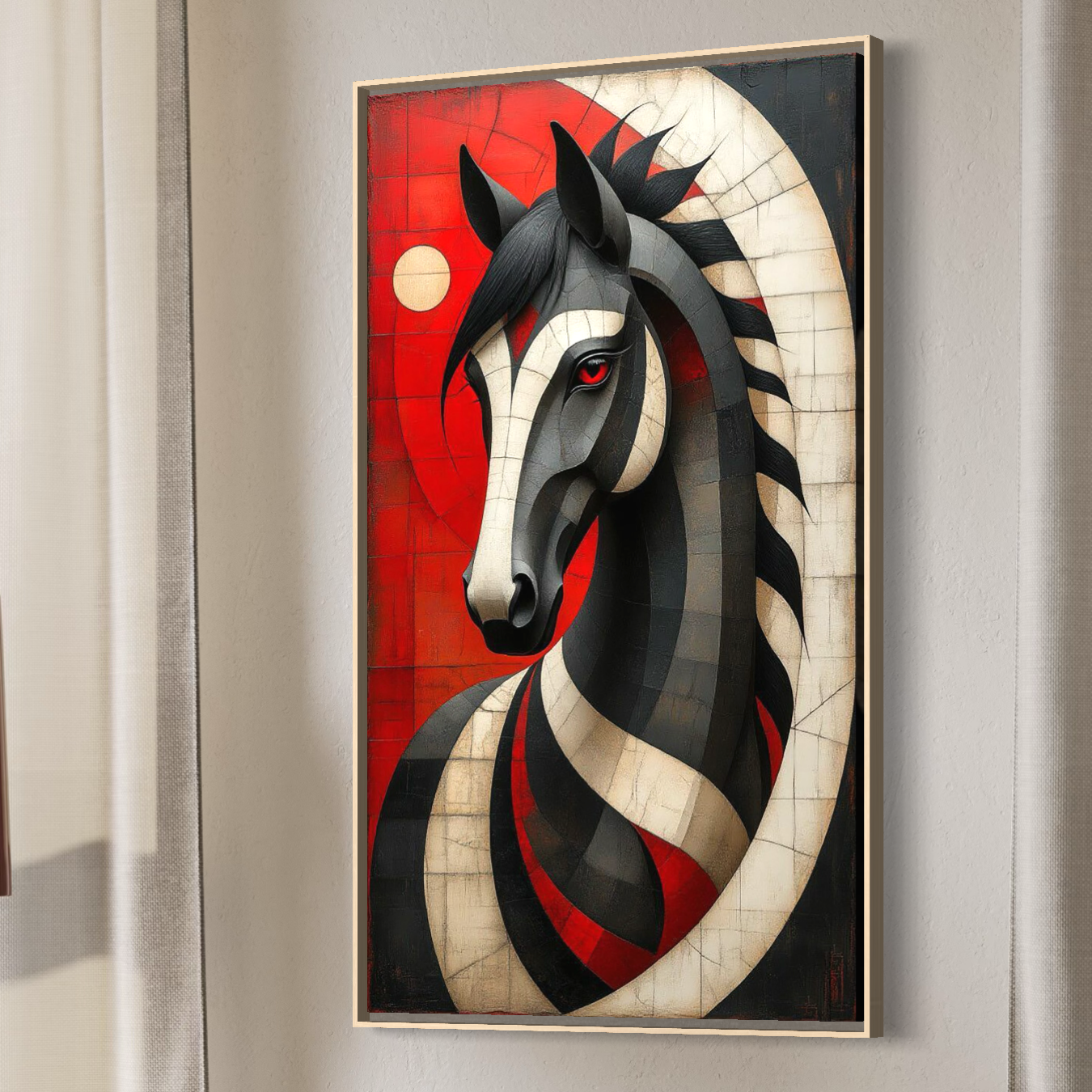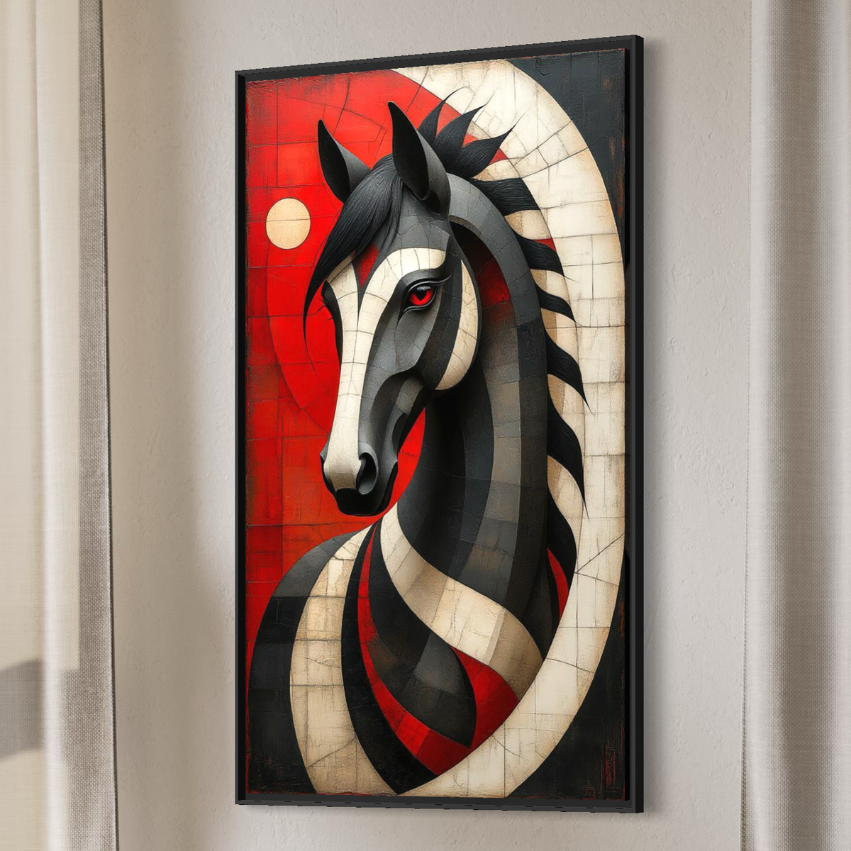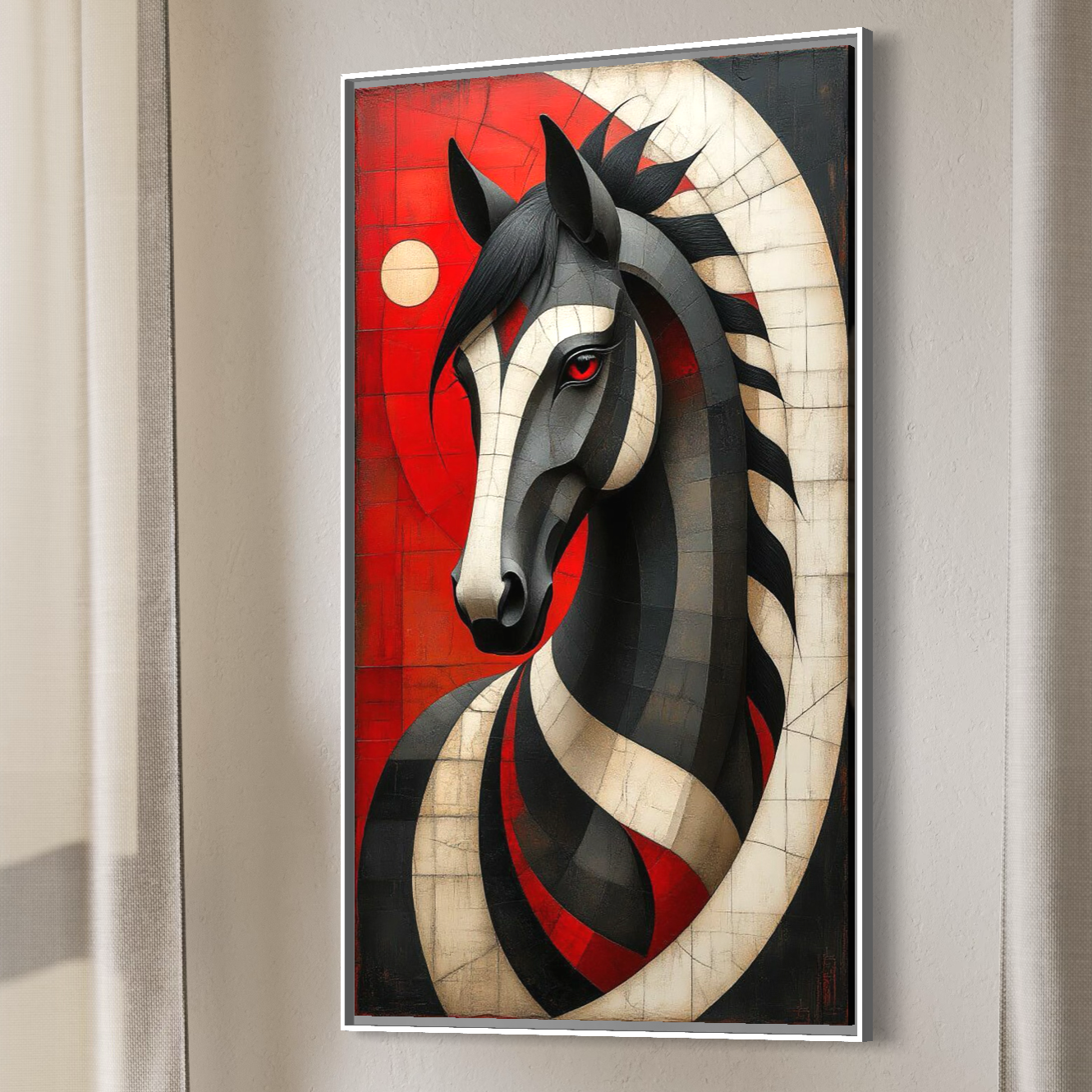 Tablou Canvas Premium, LuxCanva® C1303, Calul din foc si umbra, Geometrie, Culori, Abstract, Rosu, Foc, Linii, Cal, Frumusete, Animal, Veghe, Paznic, Simbol, Design, Arta, Birou, Living, Dormitor