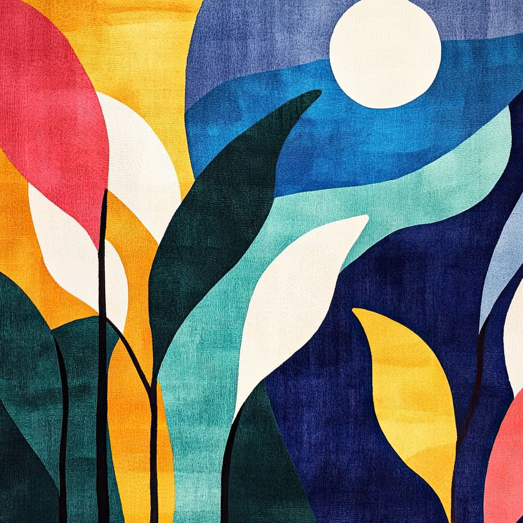 Tablou Canvas Premium, LuxCanva® J1009, Sub Lumina Lunii, Noapte, Tropicala, Gradina, Culori, Albastru, Ecosistem, Cromatic, Peisaj, Luna, Soare, Living, Dormitor - 45 X 60