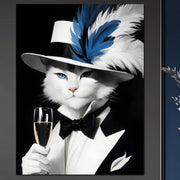 Tablou Canvas Premium, LuxCanva® M1200, Pisica Aristocrata, Sampanie, Pahar, Lux, Felina, Pene, Palarie, Costum, Fashion, Sofisticat, Pisica, Glam, Chic, Birou, Living, Camera Copil - 45 X 60