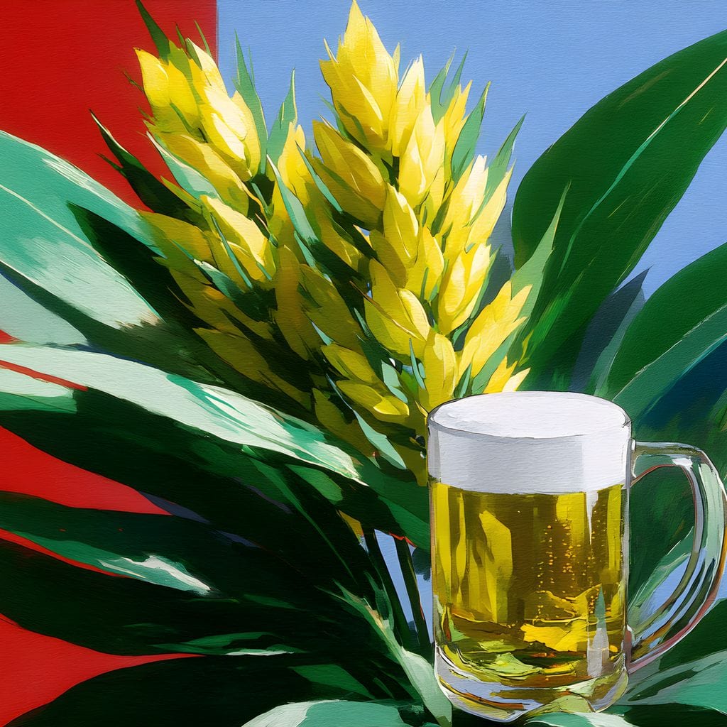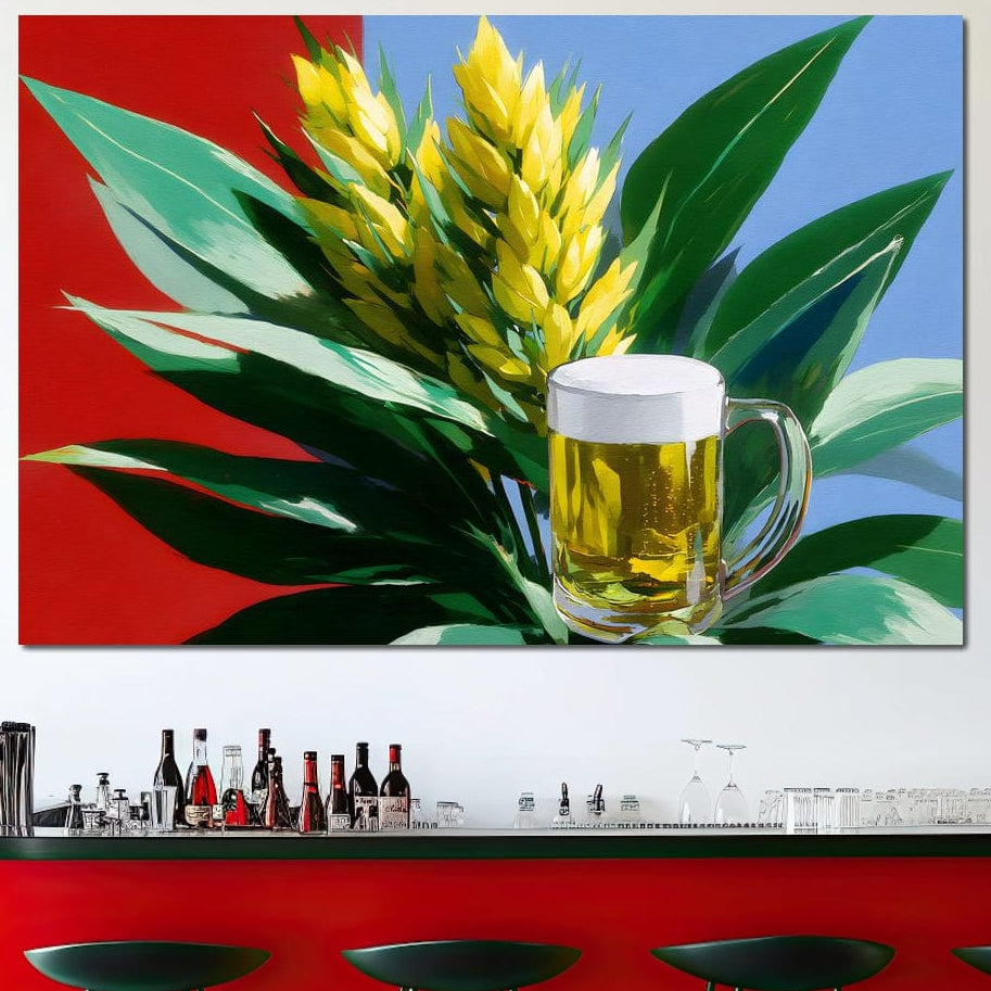 Tablou Canvas Premium, LuxCanva® N1143, Funky Beer, Hamei, Halba, Bere, Bautura, Spuma, Rece, Frunze, Creativ, Tropical, Rexalant, Pub, Bar, Lounge, Restaurant, Bucatarie