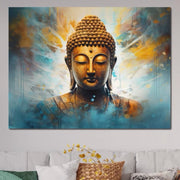 Tablou Canvas Premium LuxCanva® I123, Reflectia Iluminarii, Buddha, Zen, Iluminare, Pace Interioara, Spiritualitate, Armonie, Meditatie, Albastru, Gold, Living, Dormitor