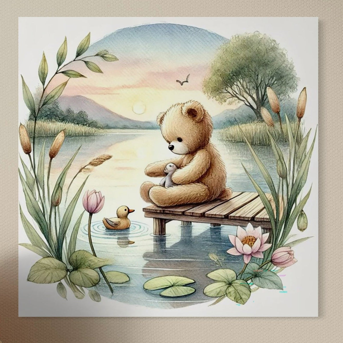 Tablou Canvas Premium, LuxCanva® K1052, Ursuletul si Ratusca, Mal, Ponton, Nuferi, Apus, Bland, Rasarit, Lac, Fermecat, Visare, Poetic, Prietenie, Legatura, Camera Copil, Dormitor - 50 X 50 / Doar Sasiu Lemn / Normala