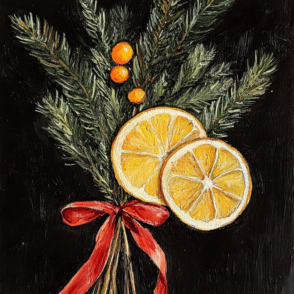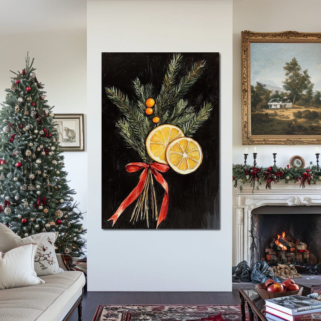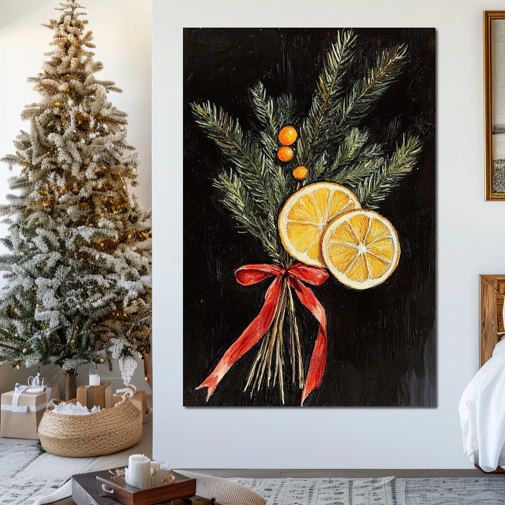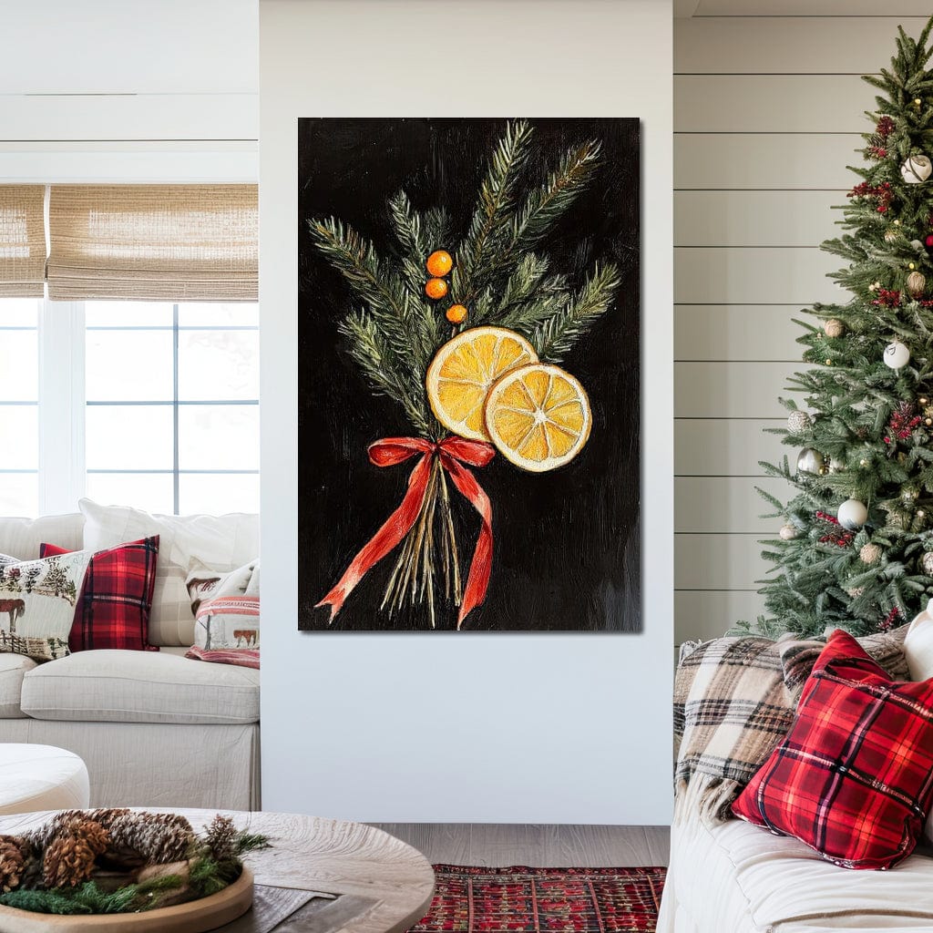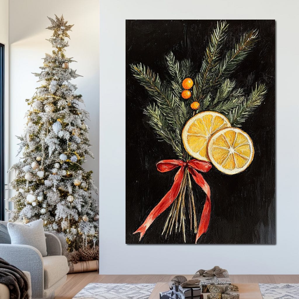Tablou Canvas Premium LuxCanva® D1015, Ramuri Aromate de Brad , Ramuri, Brad, Portocale, Miros, Living Room, Culori vibrante - 60 X 90