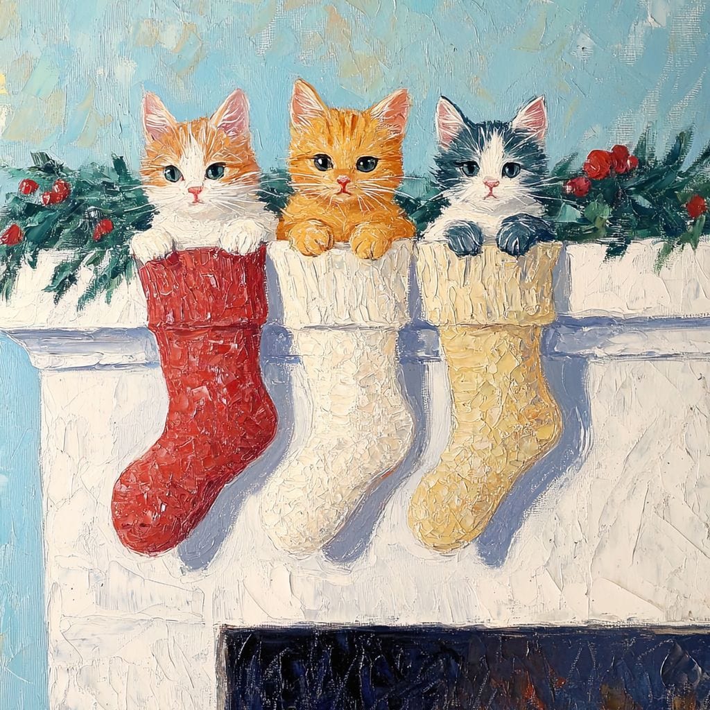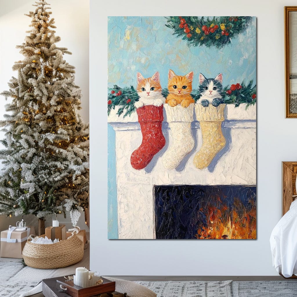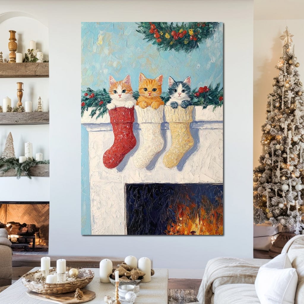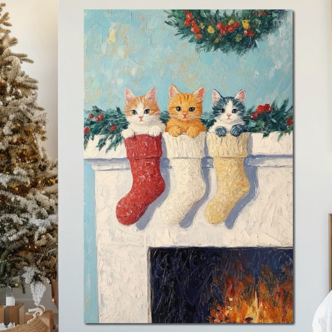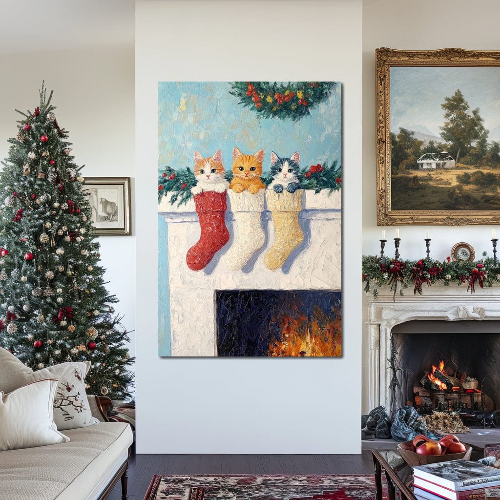 Tablou Canvas Premium LuxCanva® D1022, In asteptarea lui Mos Nicolae , Pisicute, Sosete, Semineu, Asteptare, Daruri, Living Room, Culori vibrante - 60 X 80