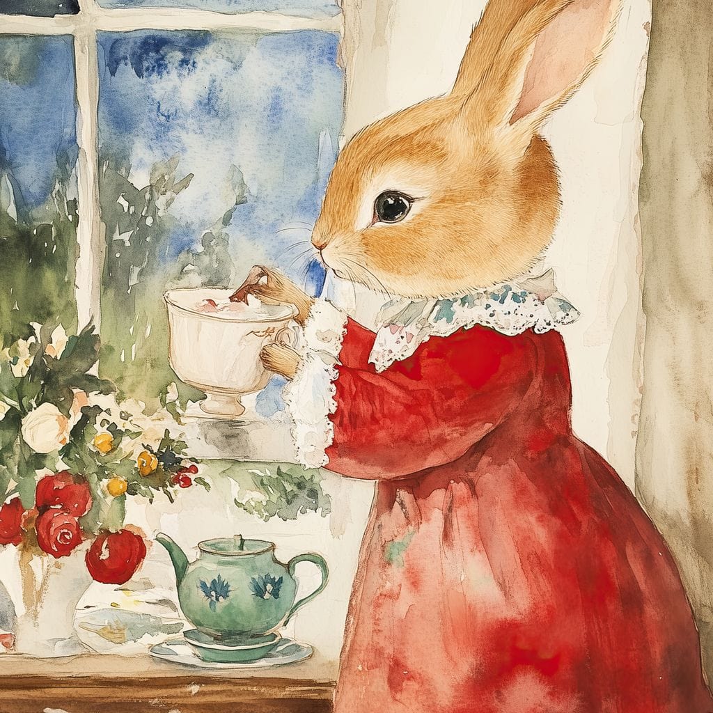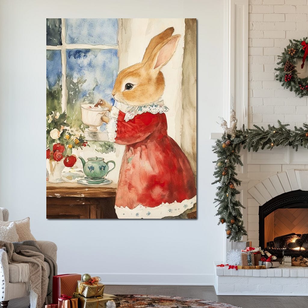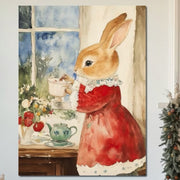 Tablou Canvas Premium LuxCanva® D1047, Iepurasul Rosu si Aroma Ceaiului , Iepure, Ceai, Fereastra, Nostalgie, Elegant, Living Room, Culori vibrante - 60 X 80