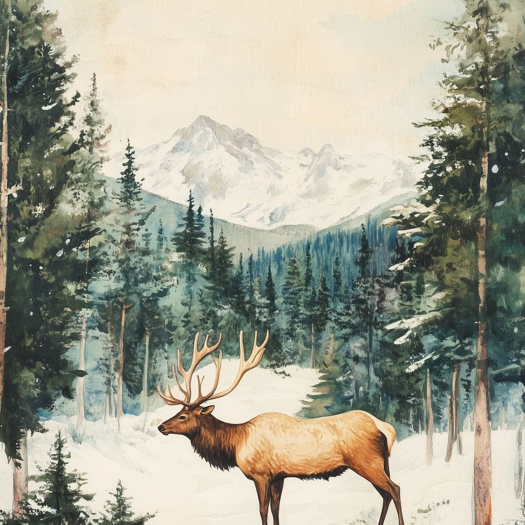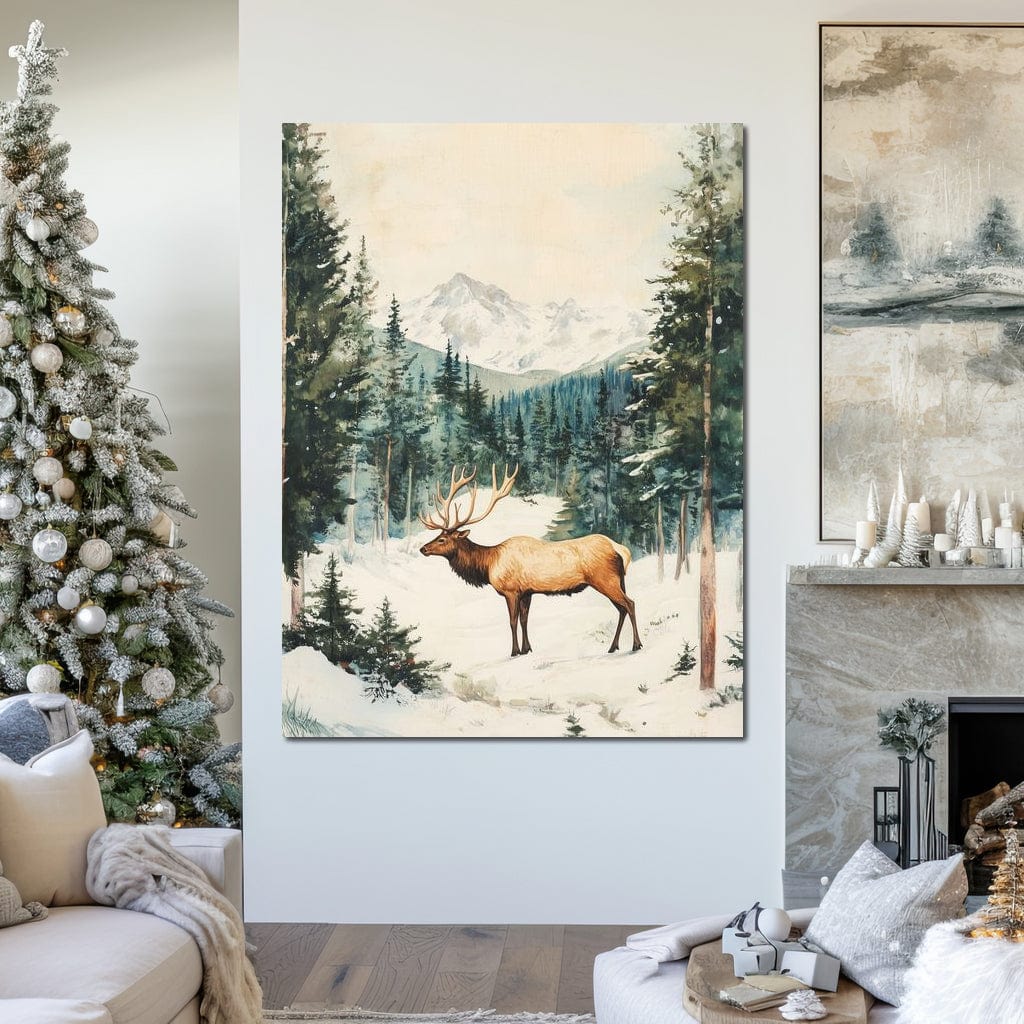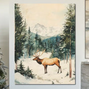 Tablou Canvas Premium LuxCanva® D1050, Cerbul din Muntii Inzapeziti , Cerb, Brazi, Munti, Natura, Zapada, Padure, Living Room, Culori vibrante - 60 X 80