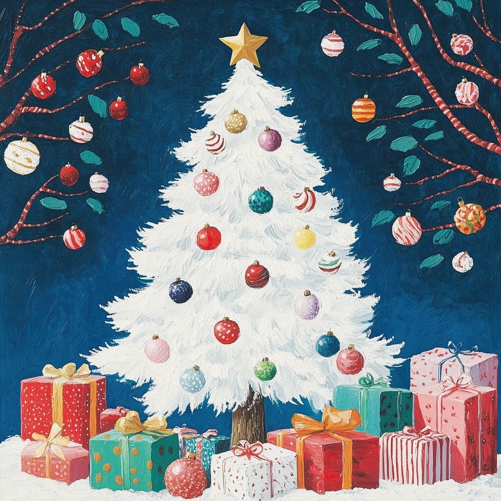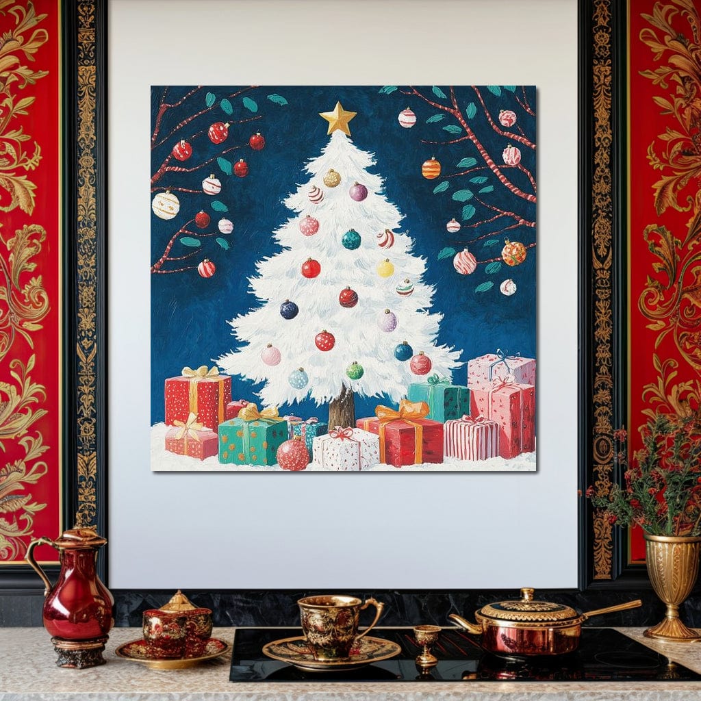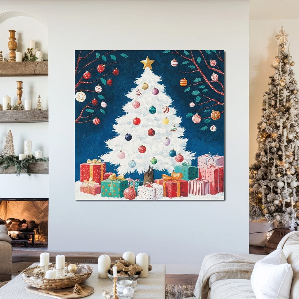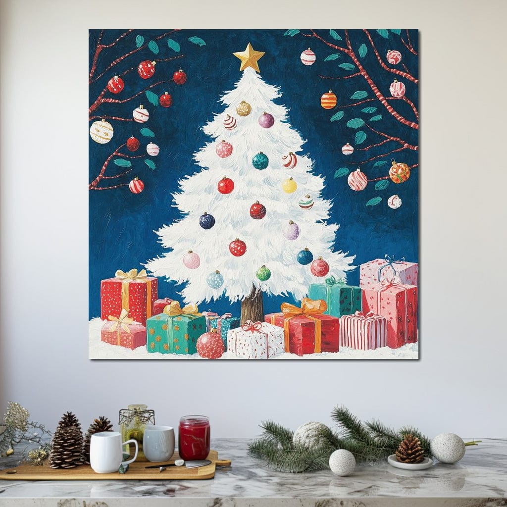 Tablou Canvas Premium LuxCanva® D1051, Farmecul Bradului Alb de Craciun , Bradut, Alb, Globulete, Cadouti, Ajun, Copilarie, Living Room, Culori vibrante - 50 X 50
