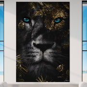 Tablou Canvas Premium LuxCanva® B1089, Frumusetea Leului Cu Ochi Albastrii , Birou, Leu, Rege, Savana, Living, Albastru, Negru, Auriu - 60 X 90