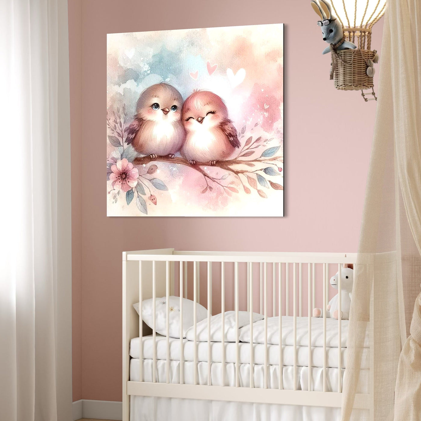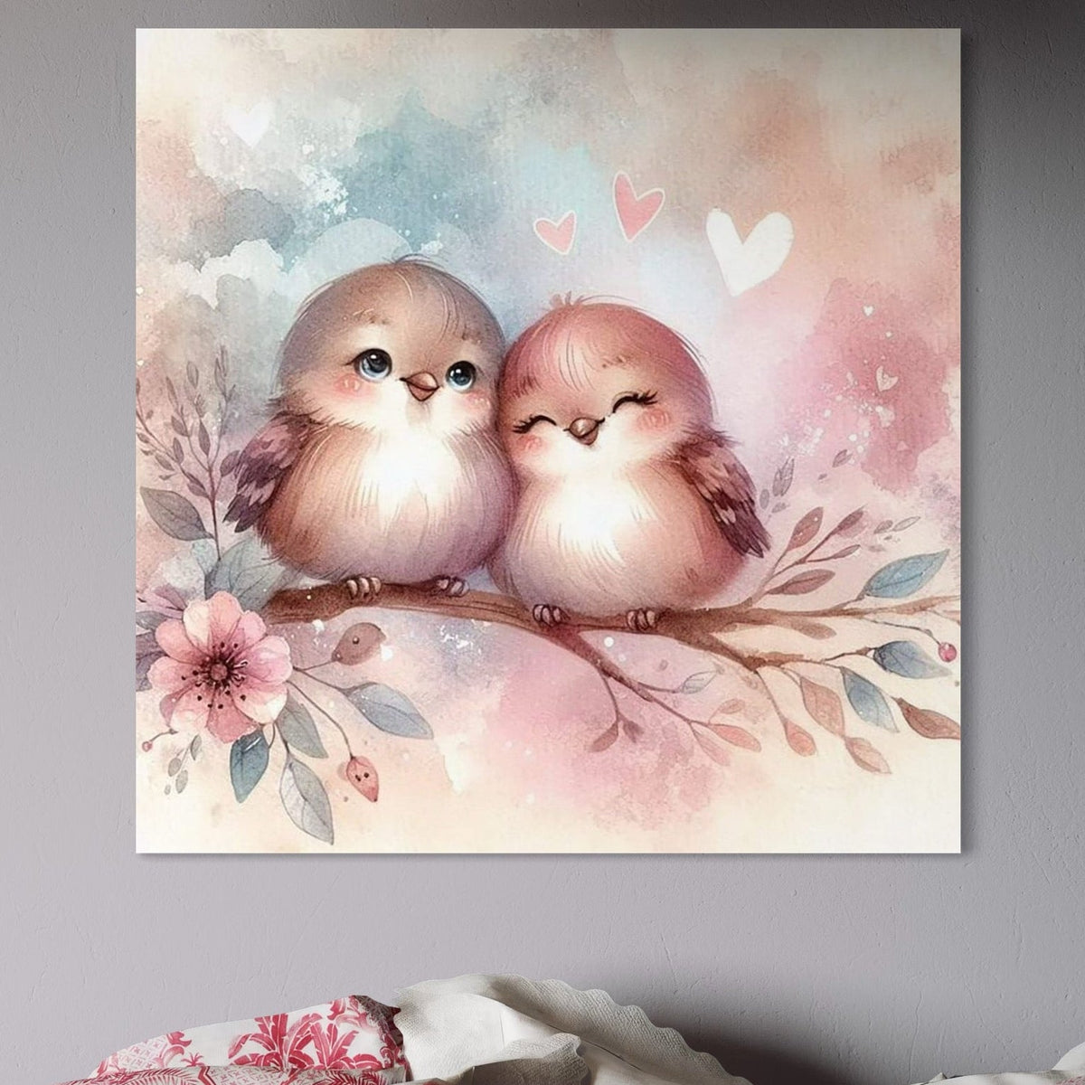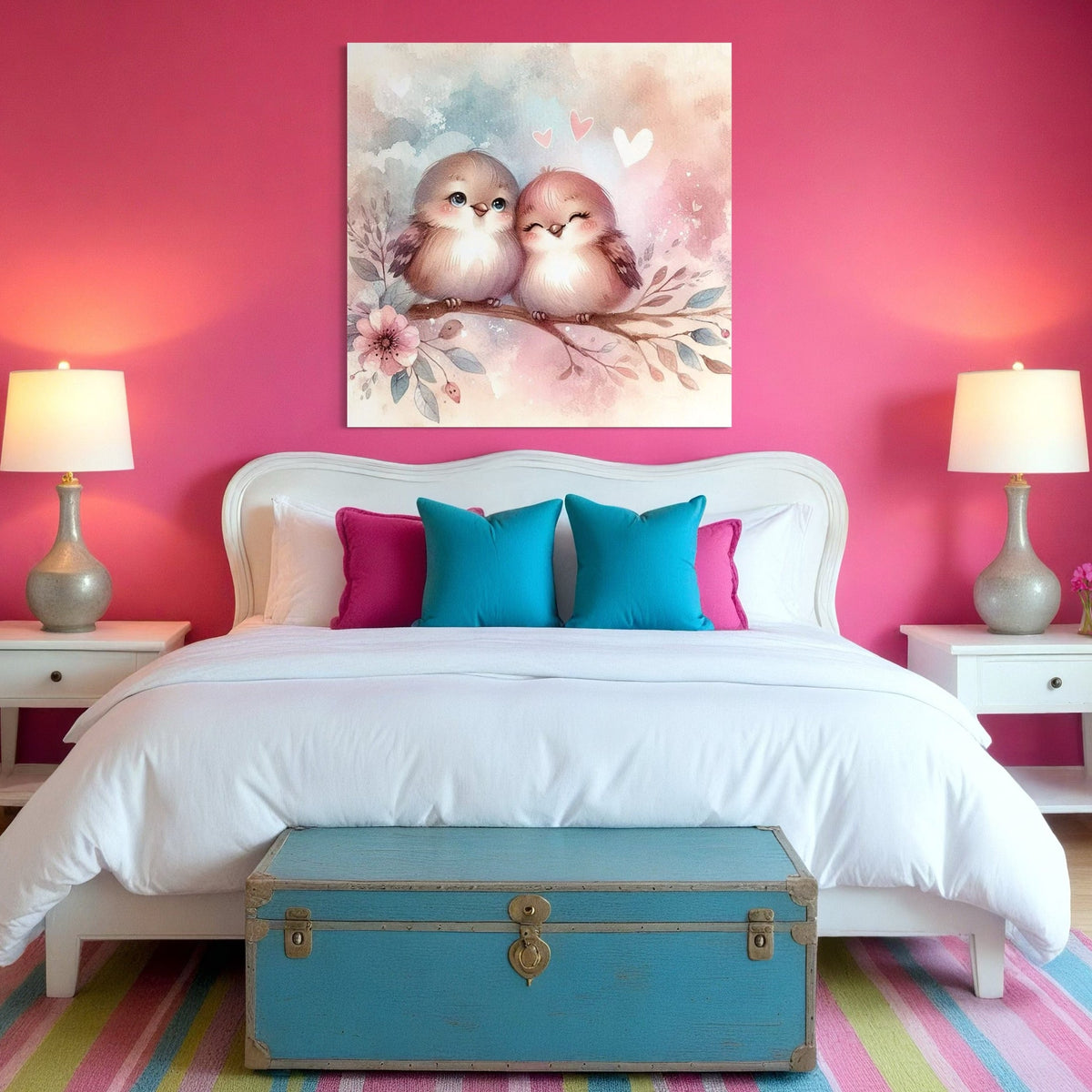 Tablou Canvas Premium, LuxCanva® K1046, Primavara in Pereche, Inimioare, Ramura, Pasarele, Cuplu, Zambet, Imbratisare, Aripi, Roz, Cuib, Inflorit, Natura, Tandrete, Copii, Camera Copil, Dormitor - 50 X 50 / Doar Sasiu Lemn / Normala