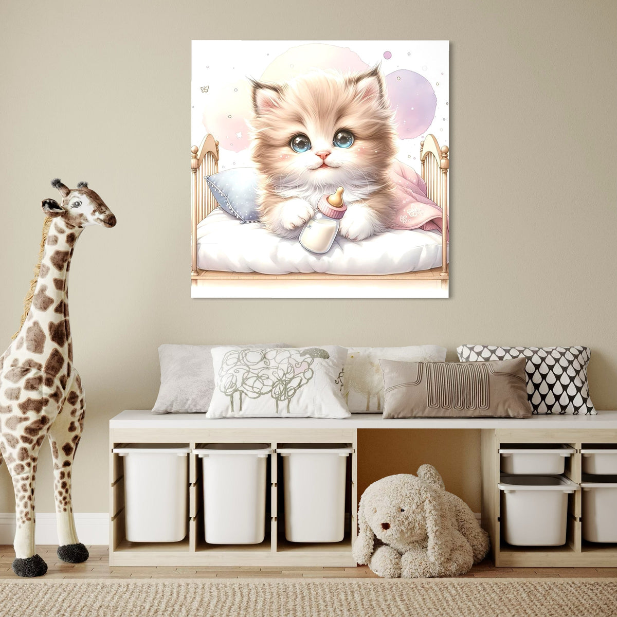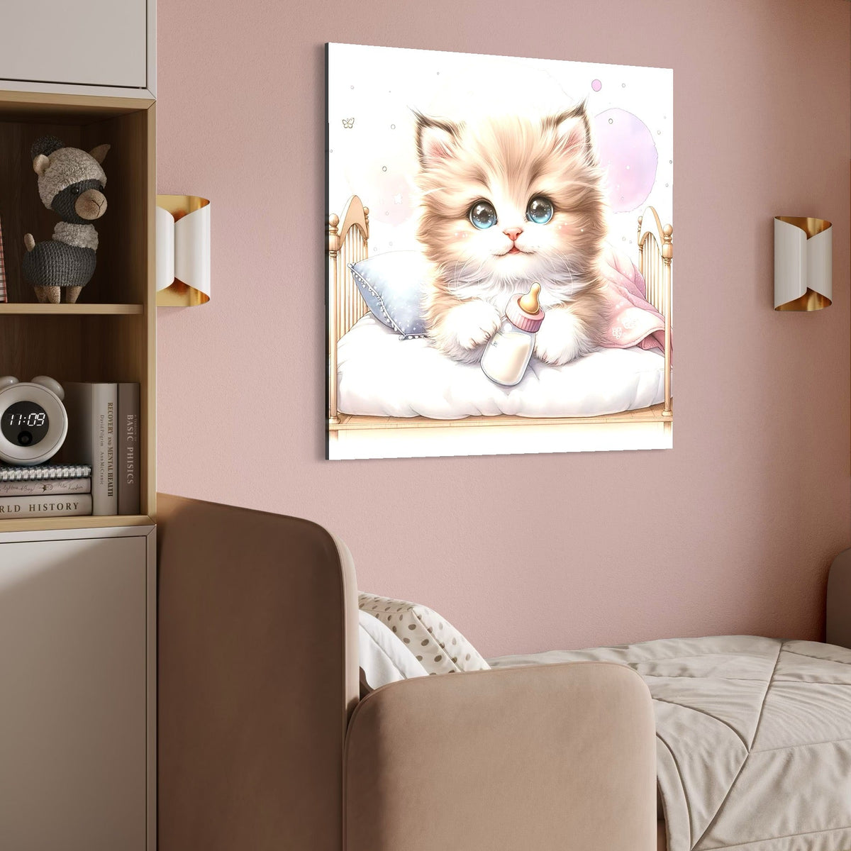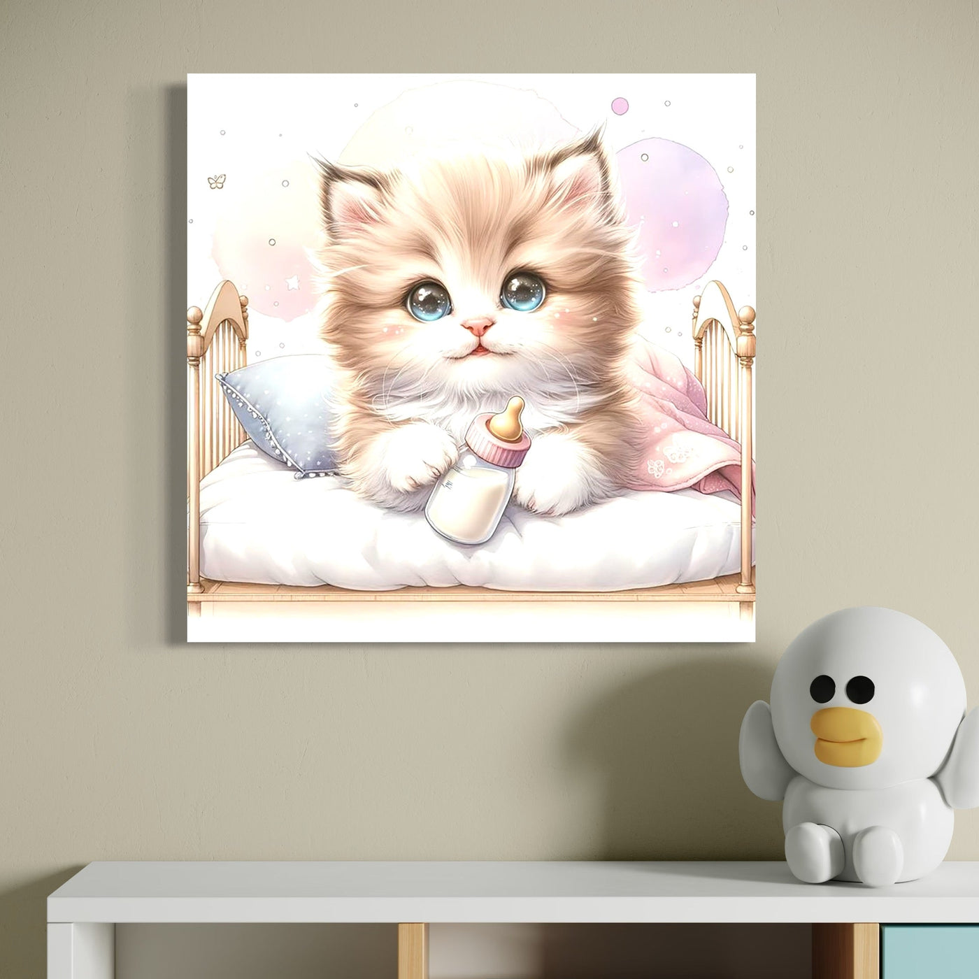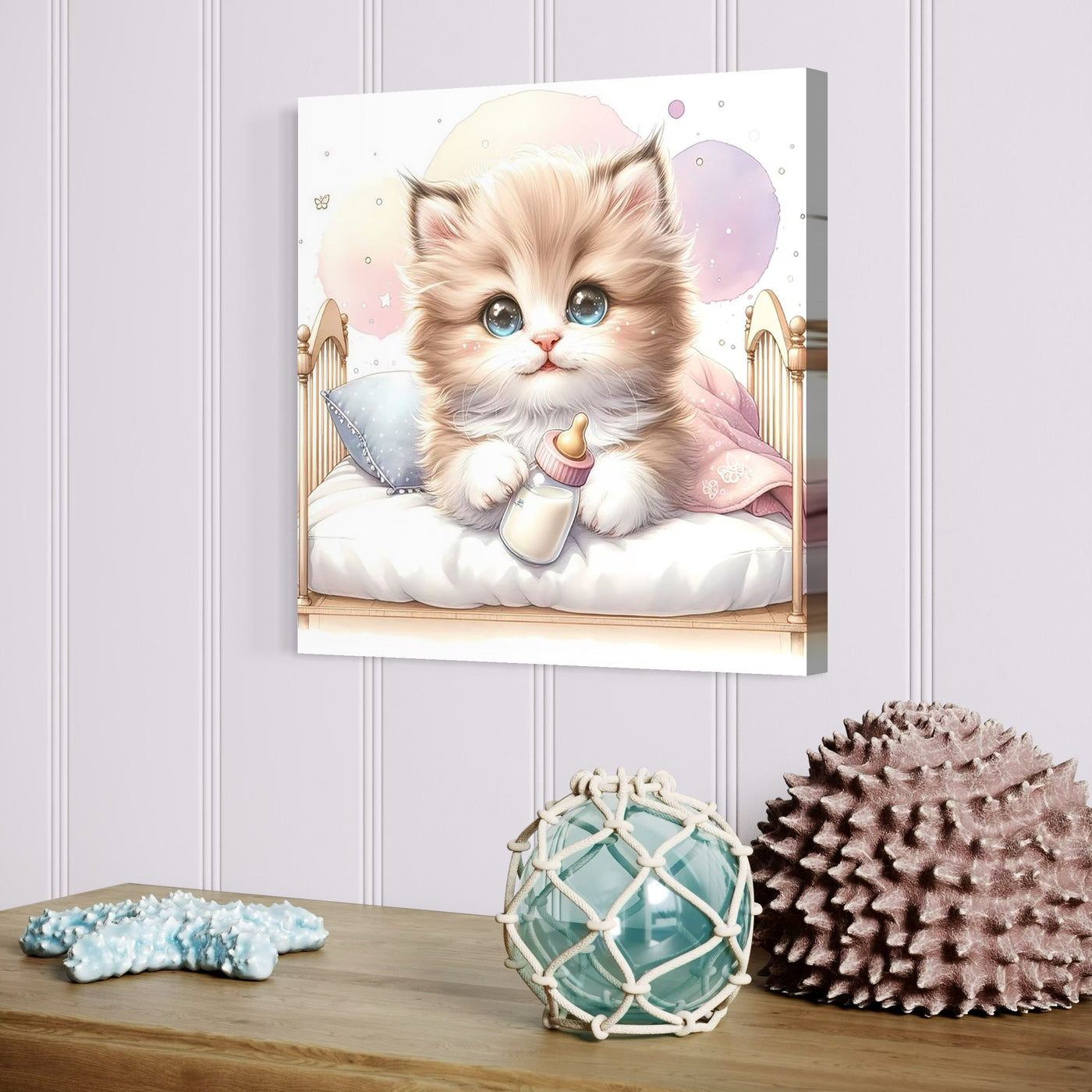 Tablou Canvas Premium, LuxCanva® K1059, Poveste de Noapte Buna, Copilarie, Biberon, Patut, Pisicuta, Pufosenie, Adorabil, Vis, Somn, Camera Copil, Dormitor - 50 X 50 / Doar Sasiu Lemn / Normala