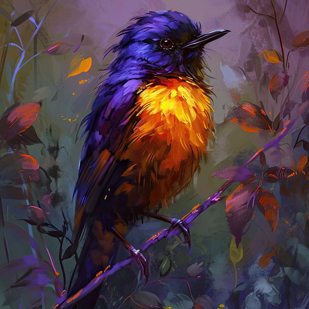 Tablou Canvas Premium, LuxCanva® M1053, Solistul Padurii de Ametist, Ramura, Padure, Ametist, Pasare, Intens, Mister, Neon, Natura, Birou, Living, Camera Copil - 45 X 60