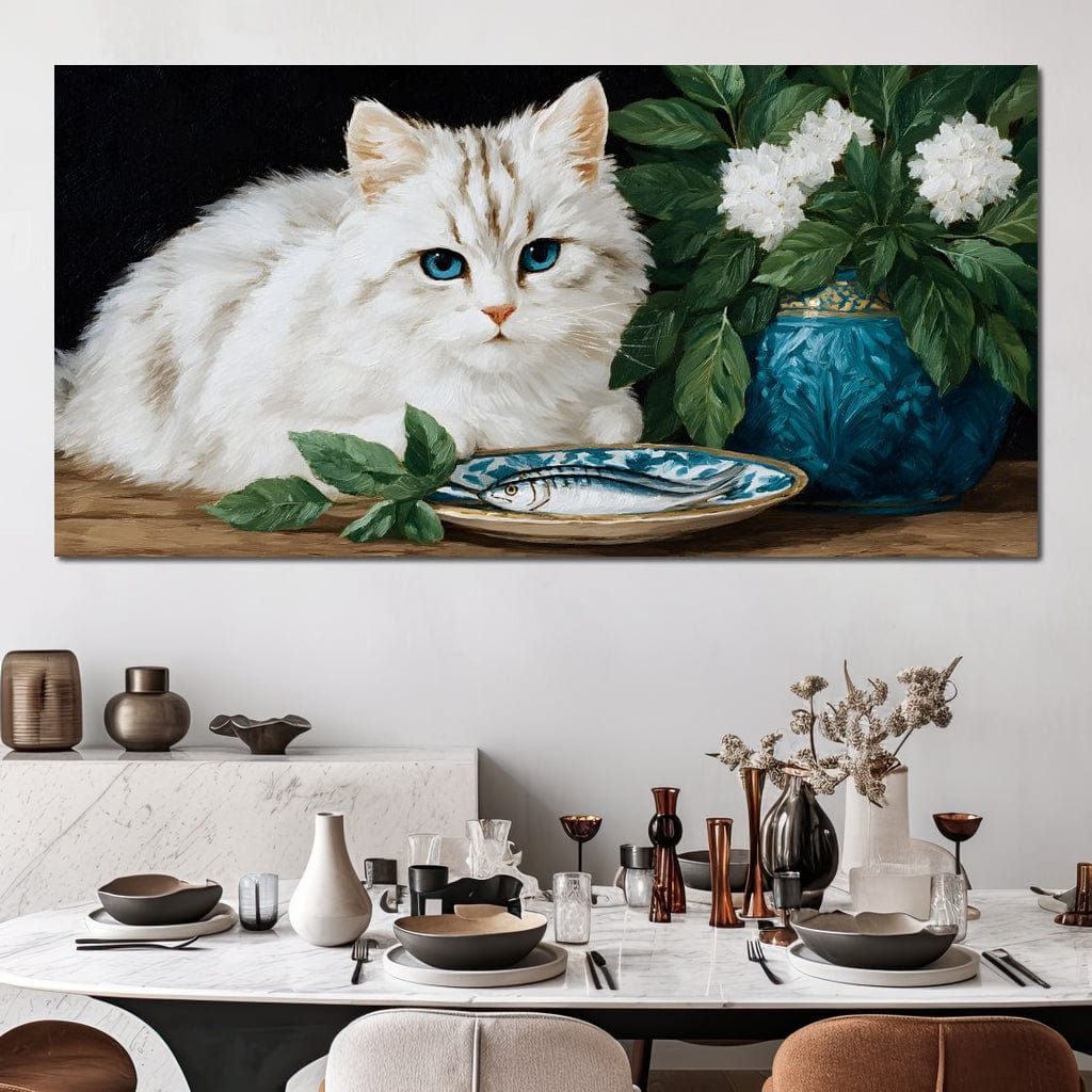 Tablou Canvas Premium, LuxCanva® M1238, Ospat Nobil, Pisica, Portelan, Vaza, Flori, Frunze, Blanita, Peste, Cina, Mancare, Farfurie, Pictura, Ceramica, Birou, Living, Camera Copil - 50 X 100