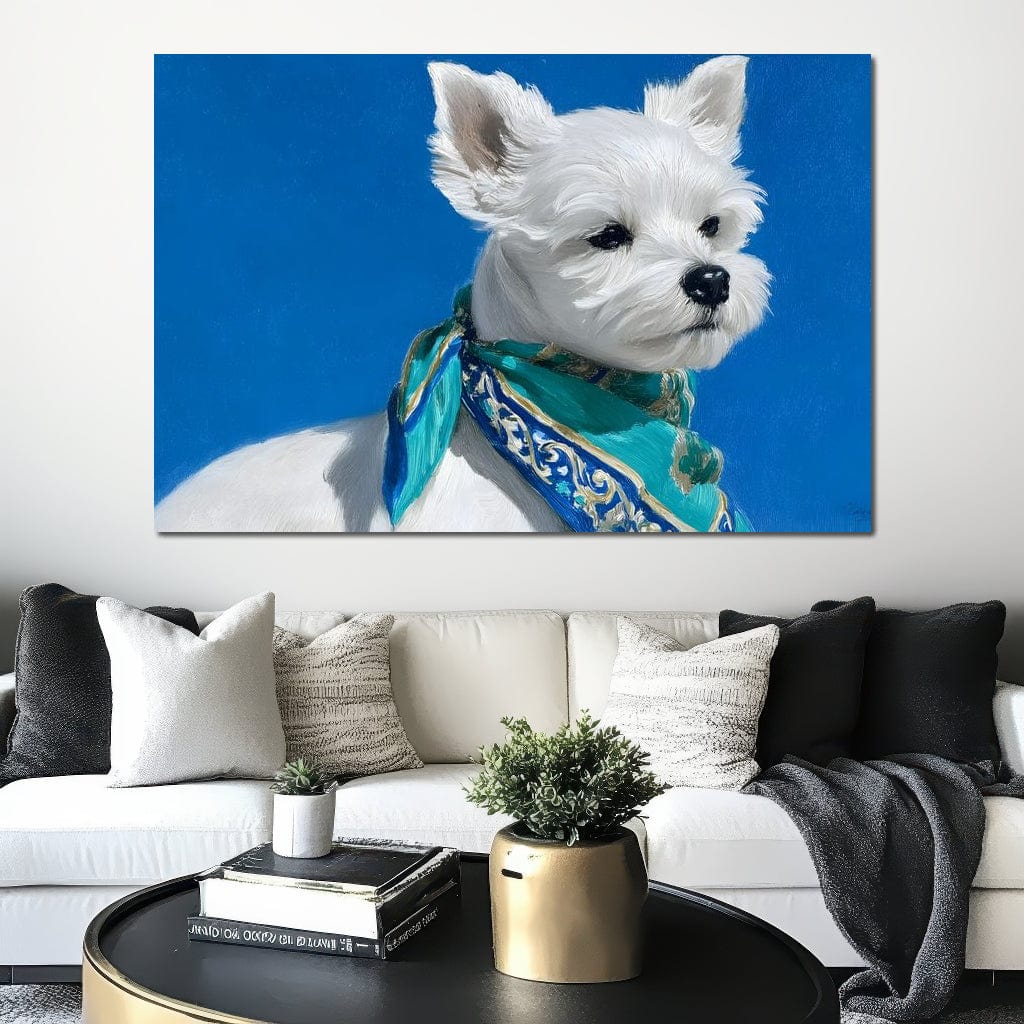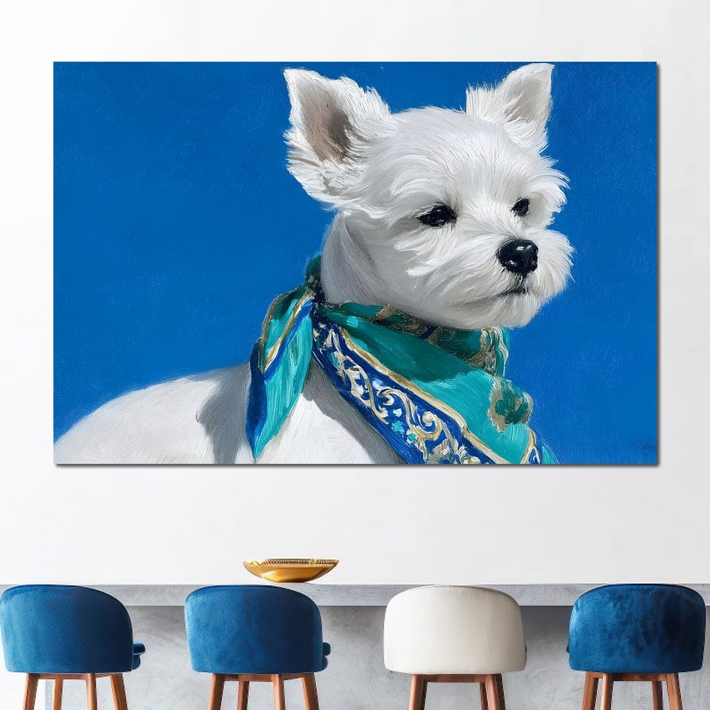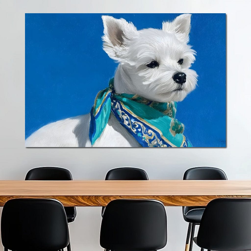 Tablou Canvas Premium, LuxCanva® M1291, Calatorul cu Esarfa, Caine, Alb, Simplitate, Mediteran, Azur, Esarfa, Patruped, Dragalas, Pufos, Pictura, Moda, Birou, Living, Camera Copil - 40 X 60