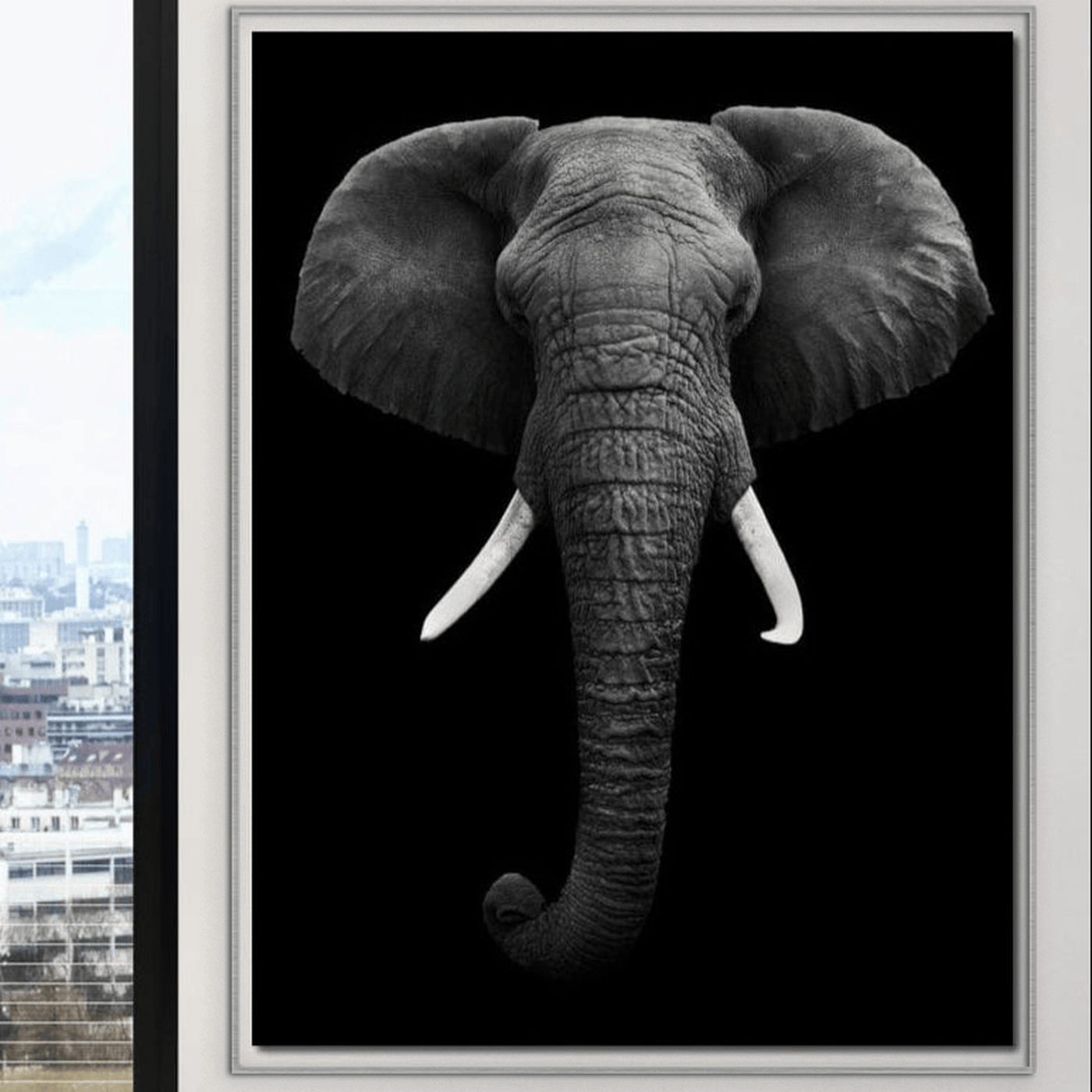 Tablou Canvas Premium, LuxCanva® M1310, Axa Puterii, Alb si Negru, Portret, Impunator, Realist, Elefant, Colti, Trompa, Animal, Simplitate, Vertical, Birou, Living, Camera Copil - 45 X 60