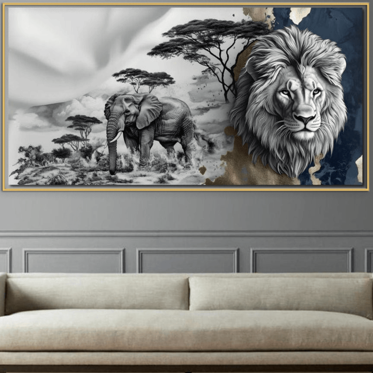 Tablou Canvas Premium, LuxCanva® M1320, Regii Savanei, Leu, Elefant, Africa, Savana, Safari, Natura, Putere, Abstract, Salbaticie, Contrast, Animale, Birou, Living, Camera Copil - 50 X 100