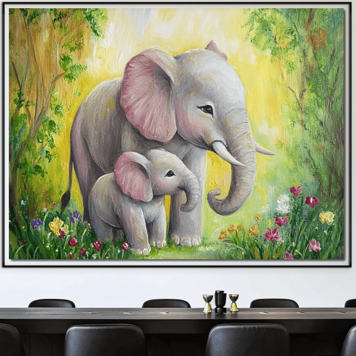 Tablou Canvas Premium, LuxCanva® M1322, Gradina Elefantilor, Afectiune, Mama, Pui, Gradina, Flori, Pictura, Culori Vibrante, Primavara, Elefanti, Dragut, Birou, Living, Camera Copil - 45 X 60