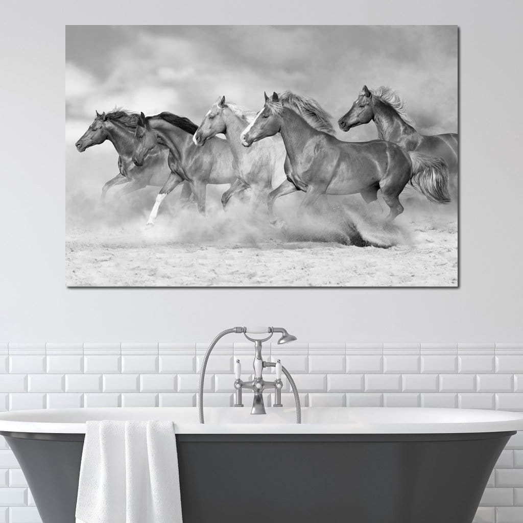 Tablou Canvas Premium, LuxCanva® M1348, Chemarea Instinctului, Alb si Negru, Libertate, Cai, Galop, Viteza, Praf, Grup, Miscare, Animal, Salbaticie, Birou, Living, Camera Copil - 40 X 60