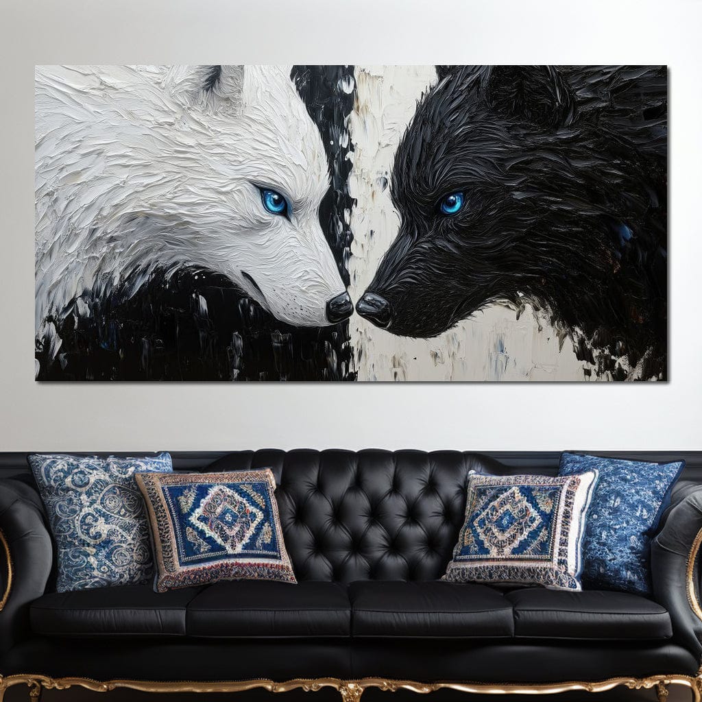 Tablou Canvas Premium, LuxCanva® M1457, Suflete in Oglinda, Dualitate, Alb si Negru, Duel, Pictura, Spirit, Echilibru, Lupi, Privire, Salbaticie, Birou, Living, Camera Copil - 50 X 100 / Doar Sasiu Lemn / Normala