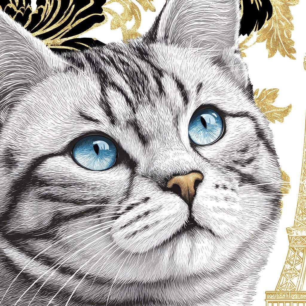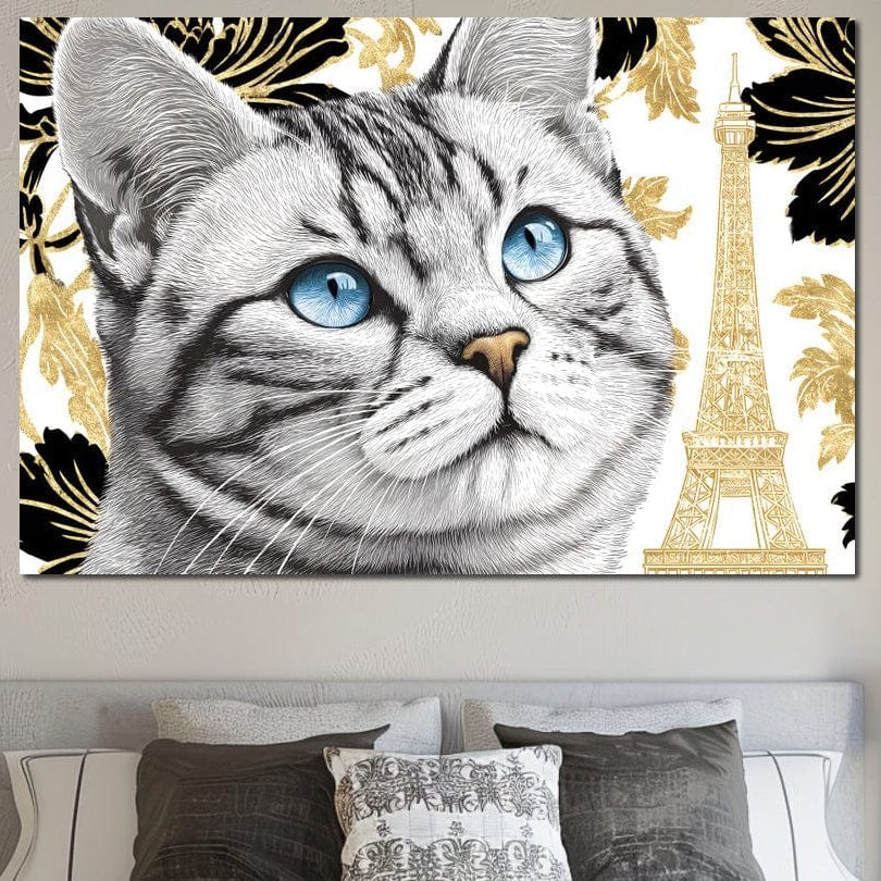 Tablou Canvas Premium, LuxCanva® M1493, Sub Cerul Parisului, Pisica, Felina, Ochi Albastri, Paris, Turnul Eiffel, Auriu, Elegant, Dormitor, Birou, Living, Camera Copil - 40 X 60 / Doar Sasiu Lemn / Normala