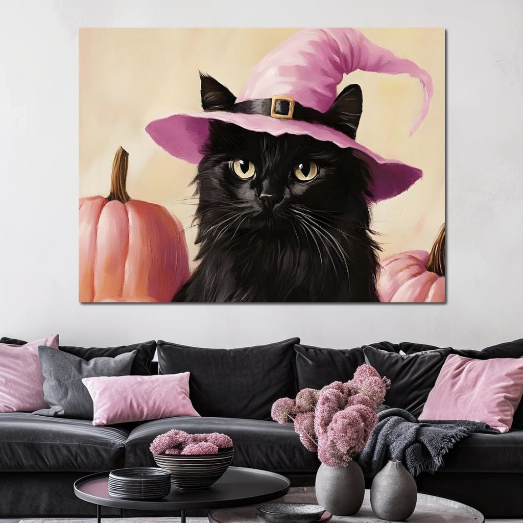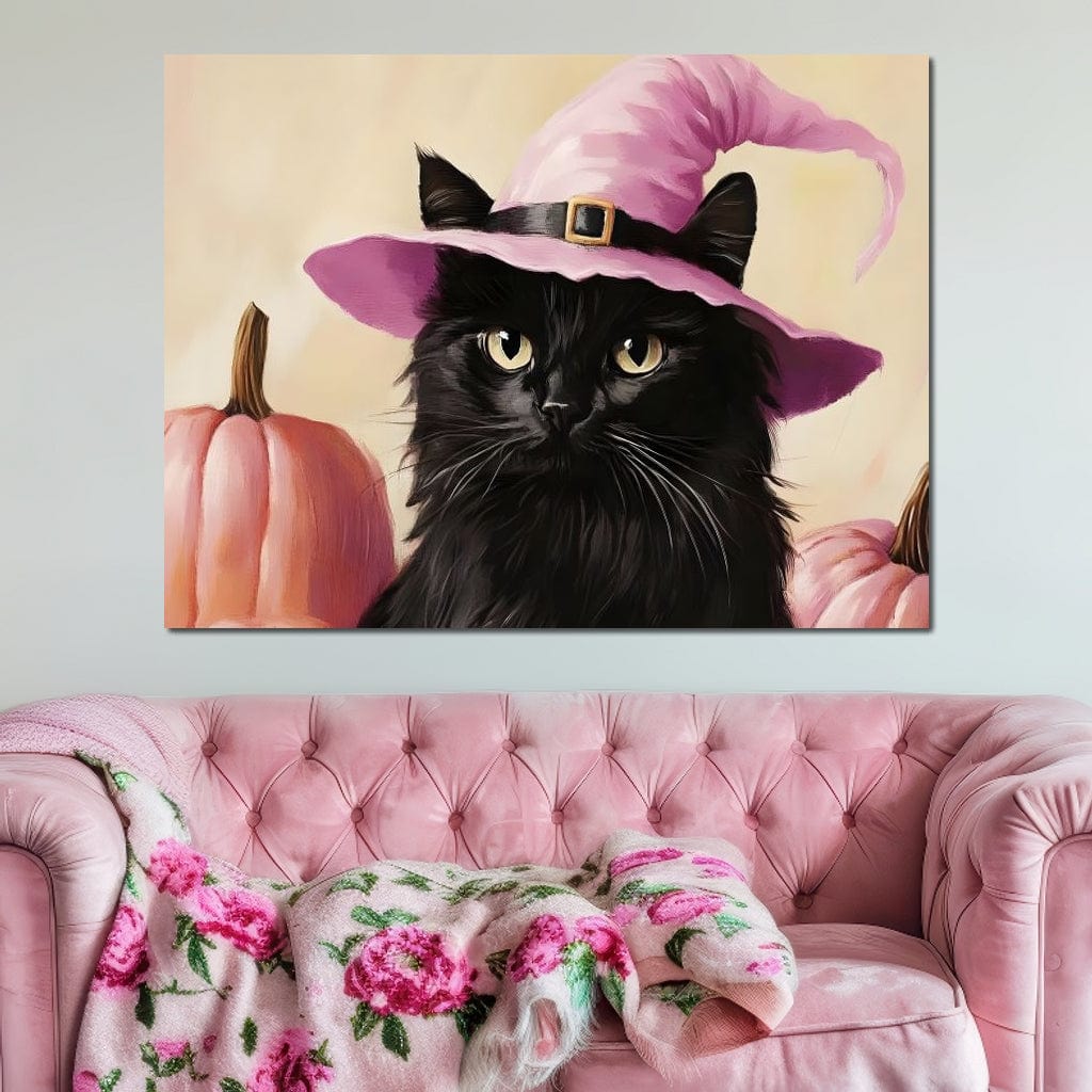 Tablou Canvas Premium, LuxCanva® N1185, Micuta Vrajitoare, Pisica, Dovleac, Witch, Roz, Palarie, Halloween, Toamna, Pub, Bar, Lounge, Restaurant, Bucatarie