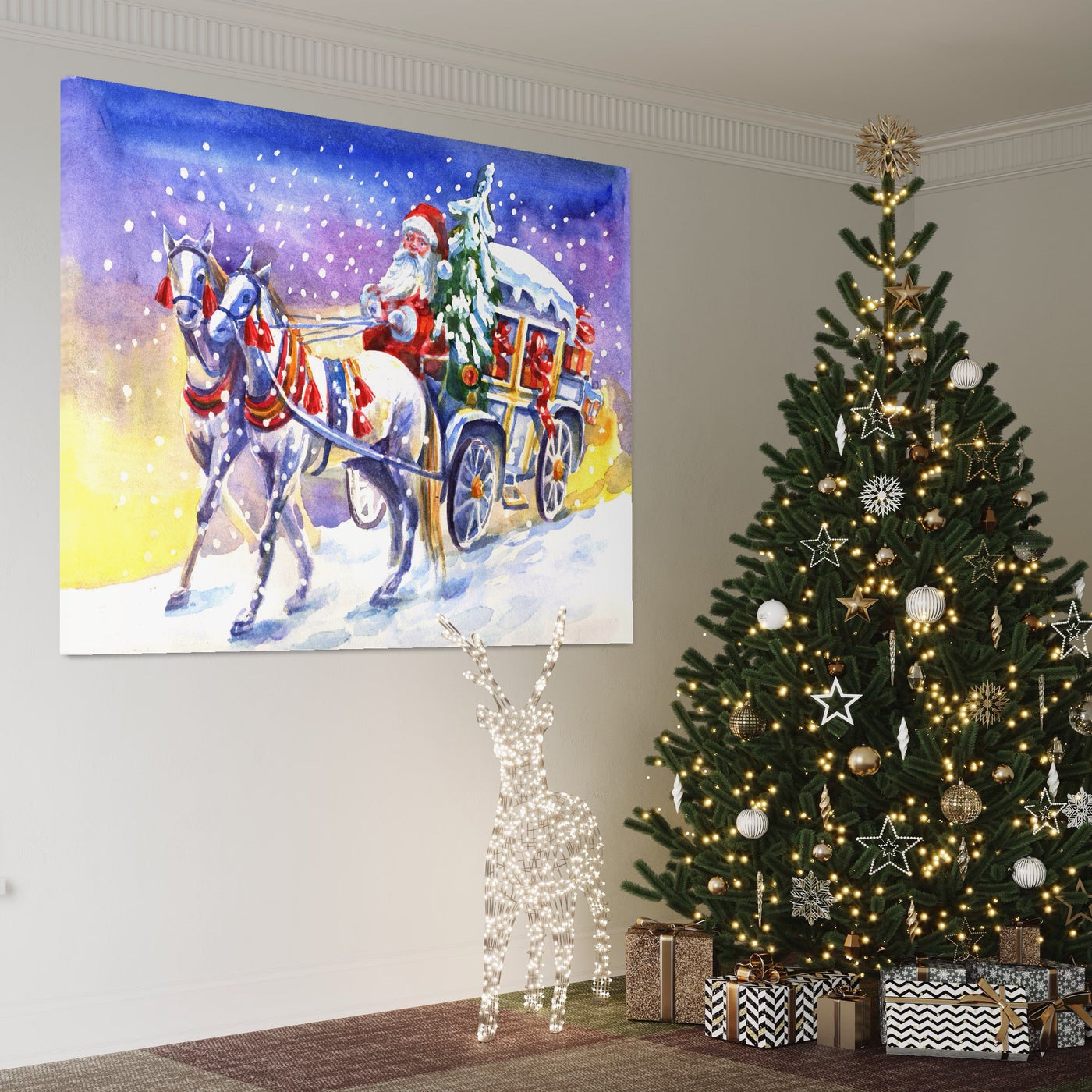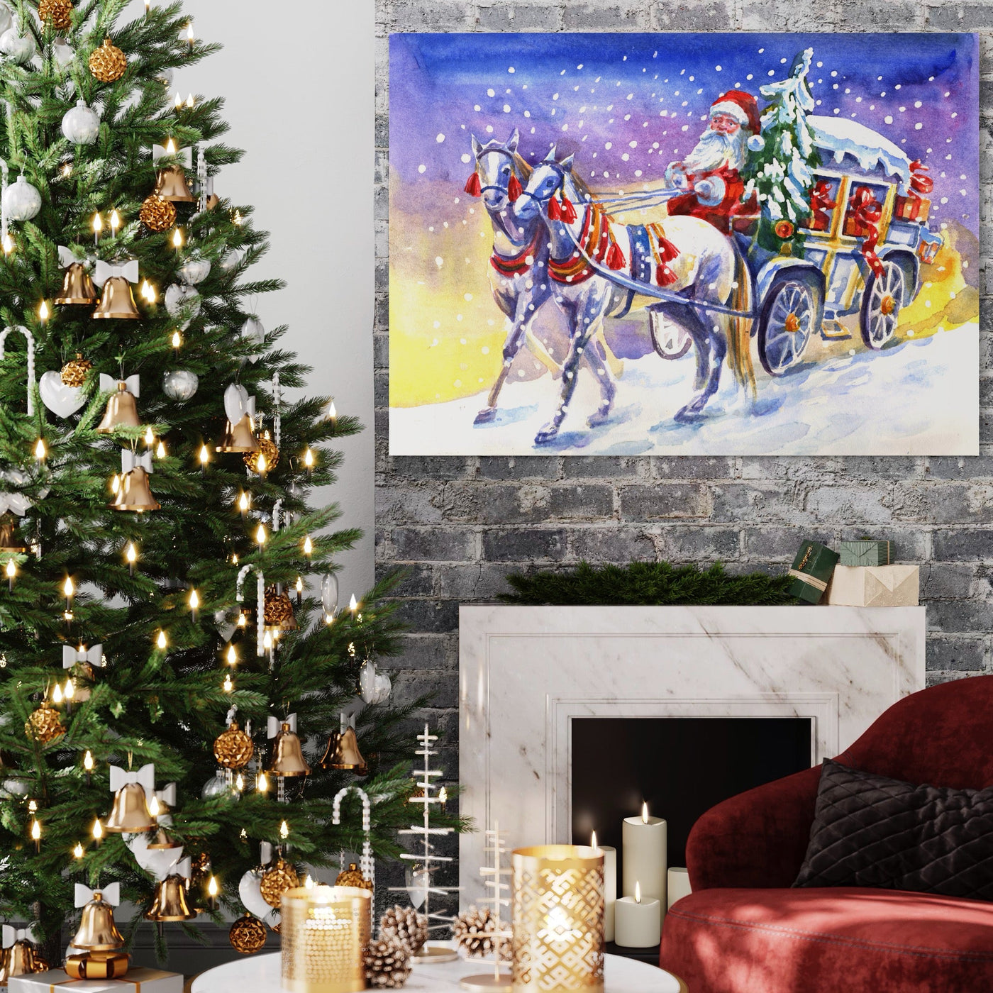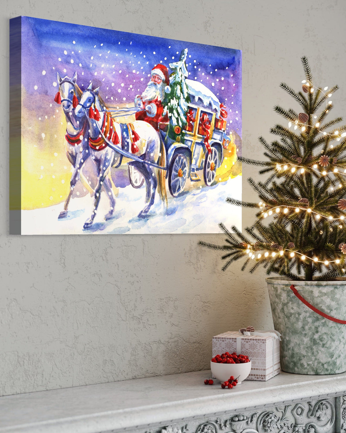 Tablou Canvas Premium LuxCanva® A1249, Mos Craciun , Decorativ, Living, Cai, Trasura, Brad, Zapada, Fulgi De Nea, Dormitor, Culori Vibrante