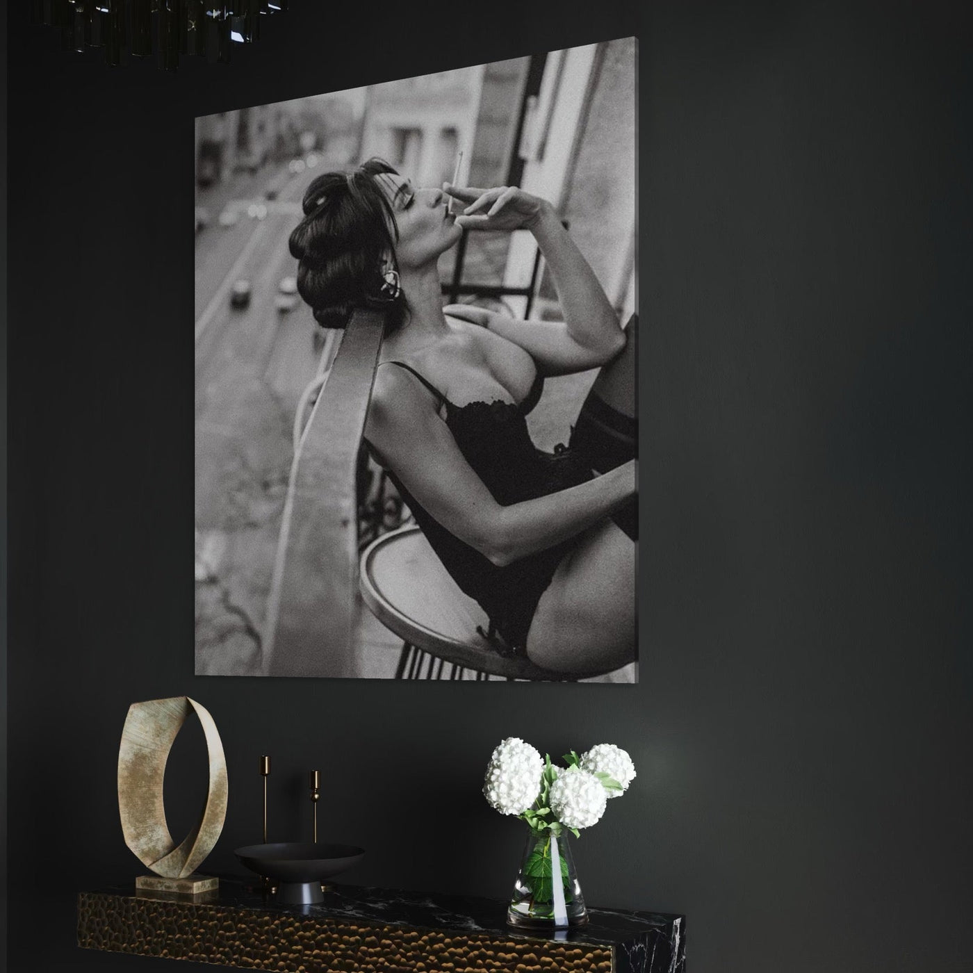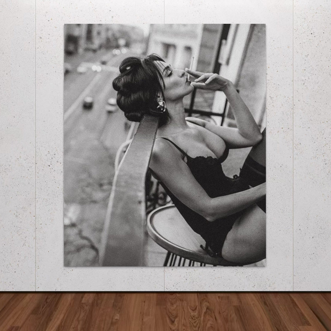 Tablou Canvas Premium, LuxCanva® P1000, Femeia de pe balcon, Alb, Negru, Tigara, Senzual, Balcon, Oras, Intimitate, Eleganta, Feminitate, Muza, Urban, Living, Dormitor - 50 X 60 / Doar Sasiu Lemn / Normala