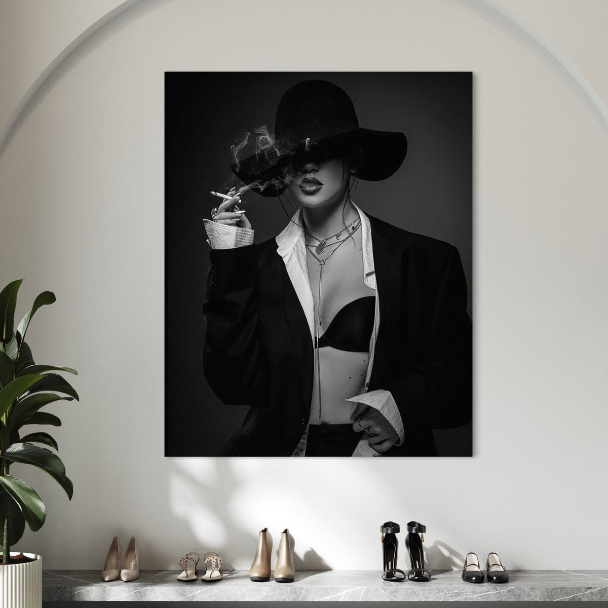 Tablou Canvas Premium, LuxCanva® P1001, Fumul Secretelor, Alb, Negru, Tigara, Fum, Senzual, Feminitate, Palarie, Seductie, Fashion, Editorial, Glamour, Atitudine, Sexy, Living, Dormitor - 40 X 50 / Doar Sasiu Lemn / Normala
