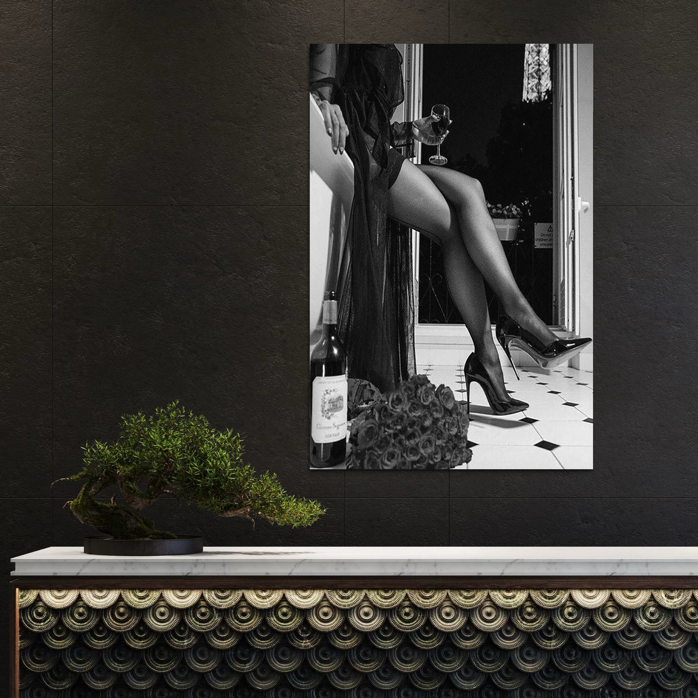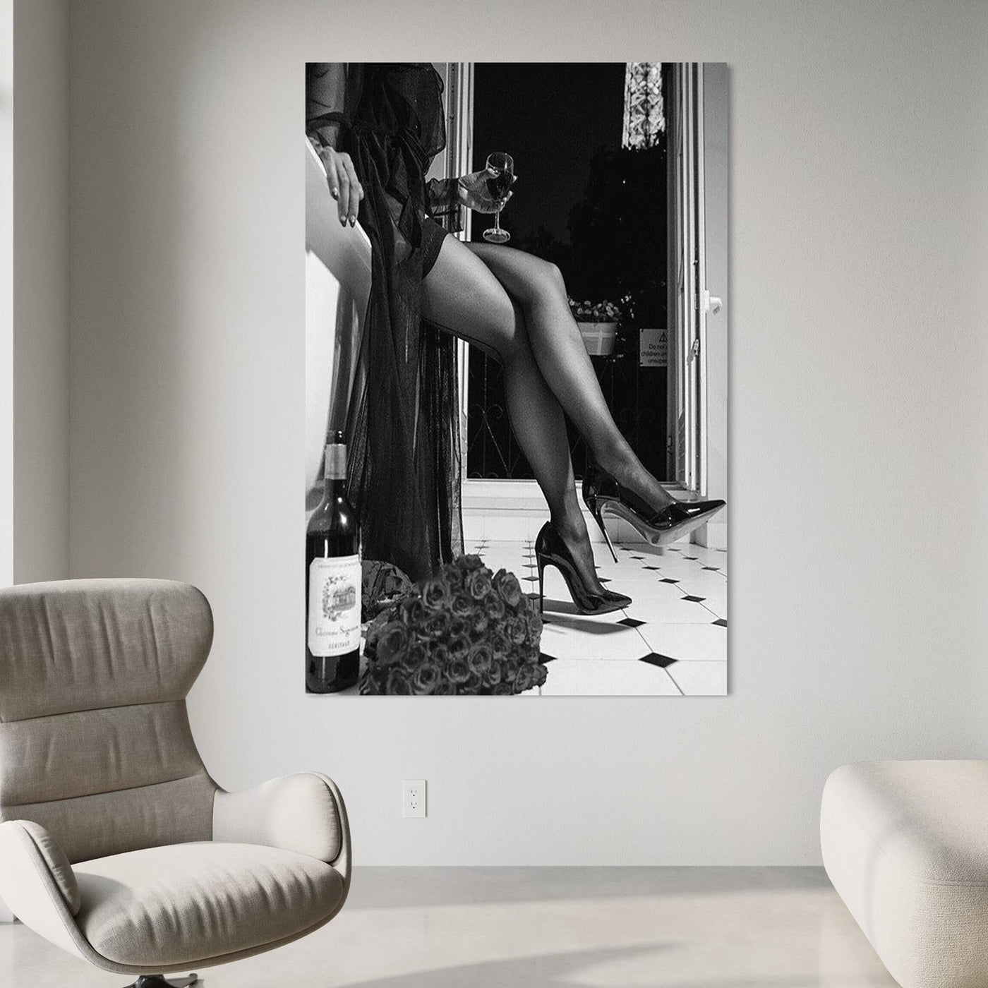 Tablou Canvas Premium, LuxCanva® P1002, Moment la Miezul Noptii, Alb, Negru, Pantofi, Toc, Dresuri, Paris, Vin, Rosu, Hotel, Dantela, Silueta, Trandafiri, Senzualitate, Living, Dormitor