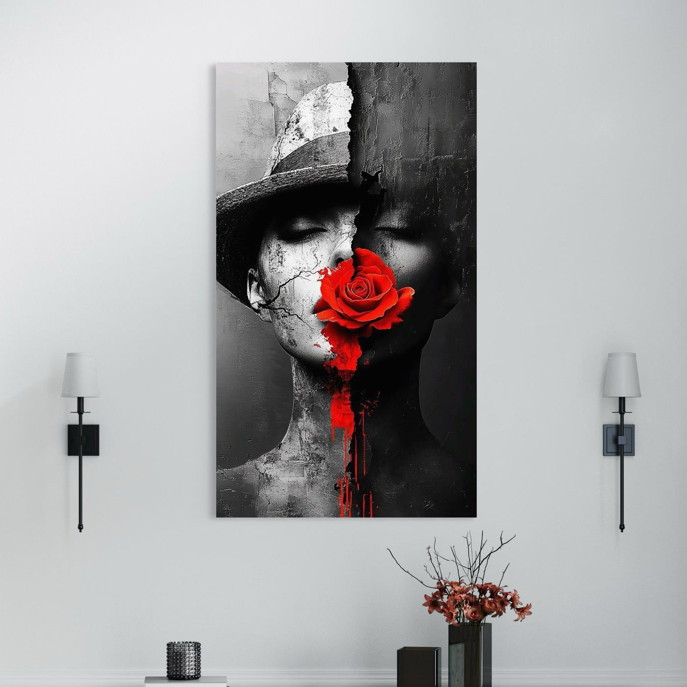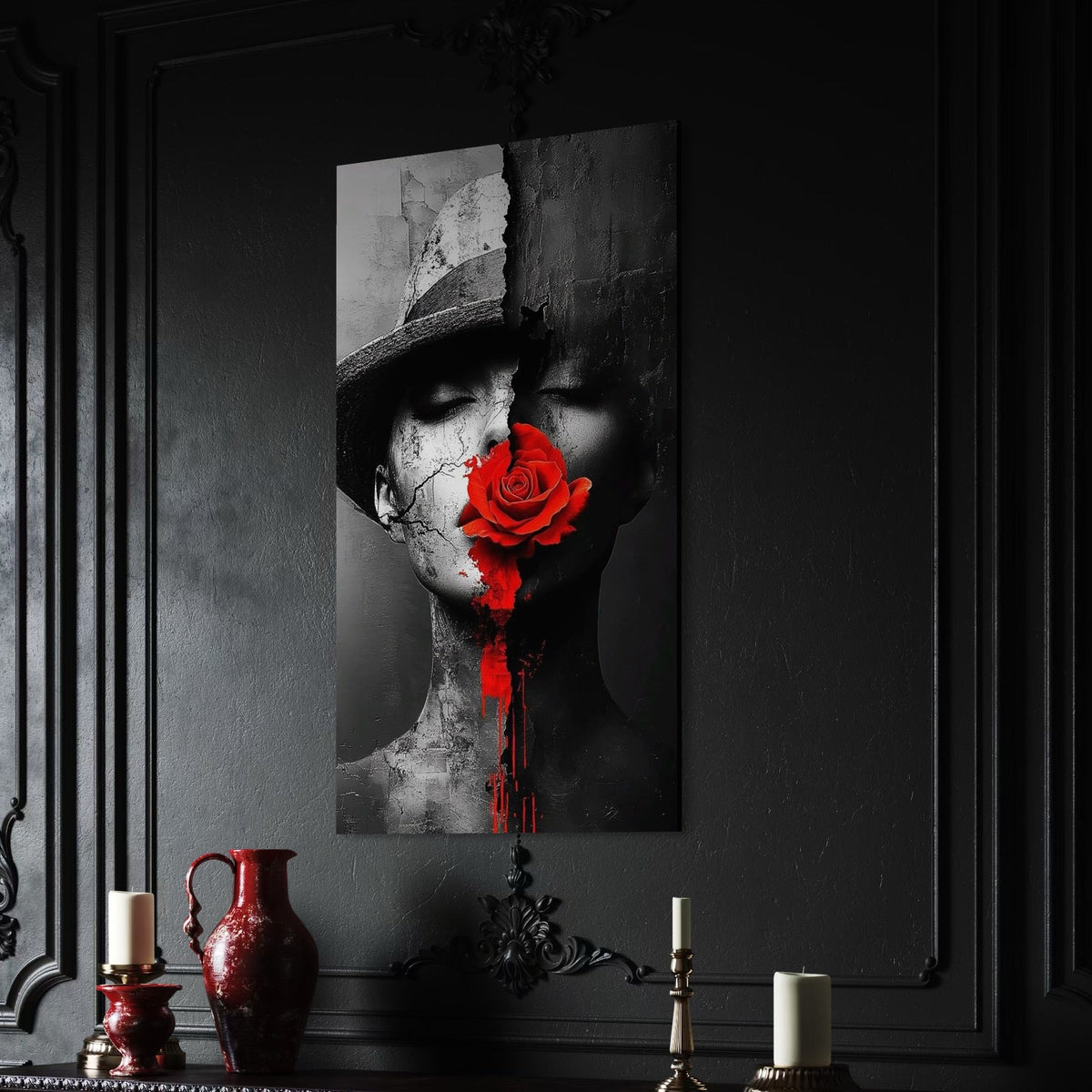 Tablou Canvas Premium, LuxCanva® P1012, Crăpături în Suflet, Rosu, Floare, Palarie, Fractura, Lumina, Intuneric, Chip, Portret, Ruine, Dualitate, Senzualitate, Living, Dormitor - 40 X 70 / Doar Sasiu Lemn / Normala