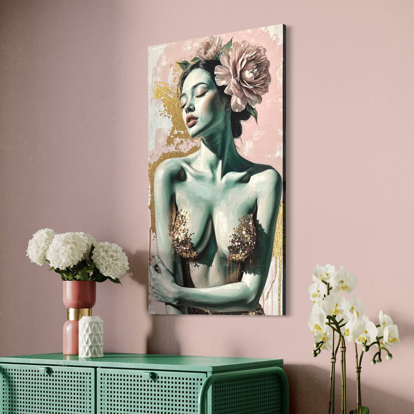 Tablou Canvas Premium, LuxCanva® P1036, Dorinta Inflorita, Floare, Roz, Trandafir, Auriu, Pastel, Femeie, Sexy, Finete, Dormitor, Living
