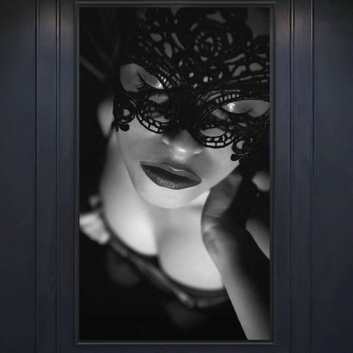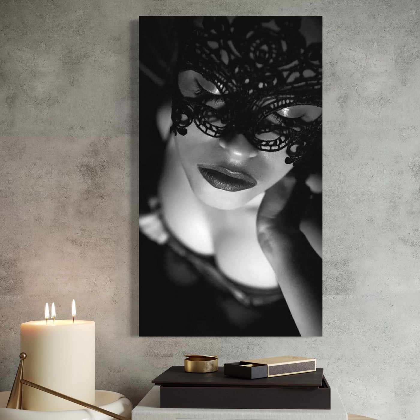 Tablou Canvas Premium, LuxCanva® P1037, Masca Pasională, Masca, Dantela, Negru, Monocrom, Senzualitate, Pasiune, Frumusete, Seducator, Mister, Dramatism, Living, Dormitor