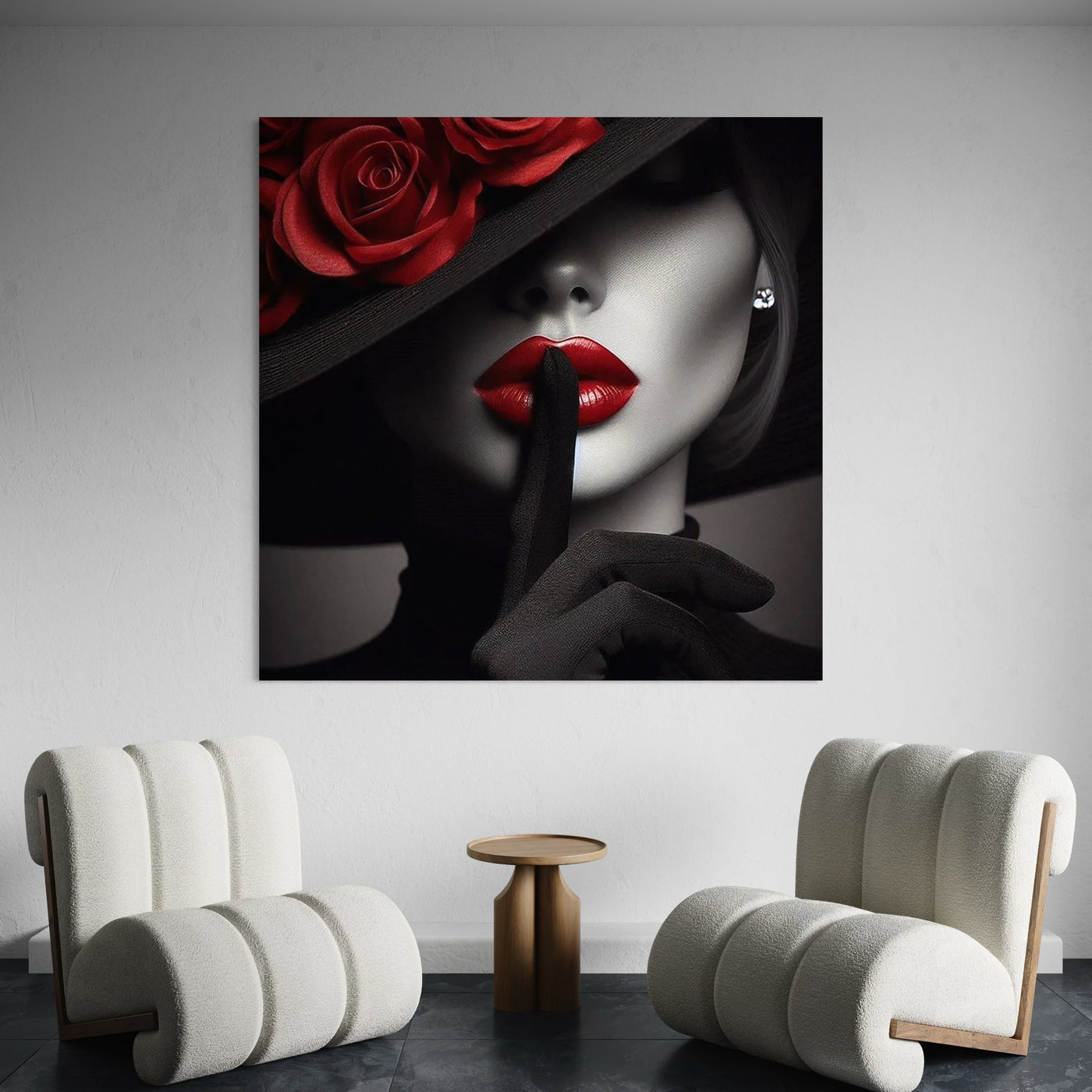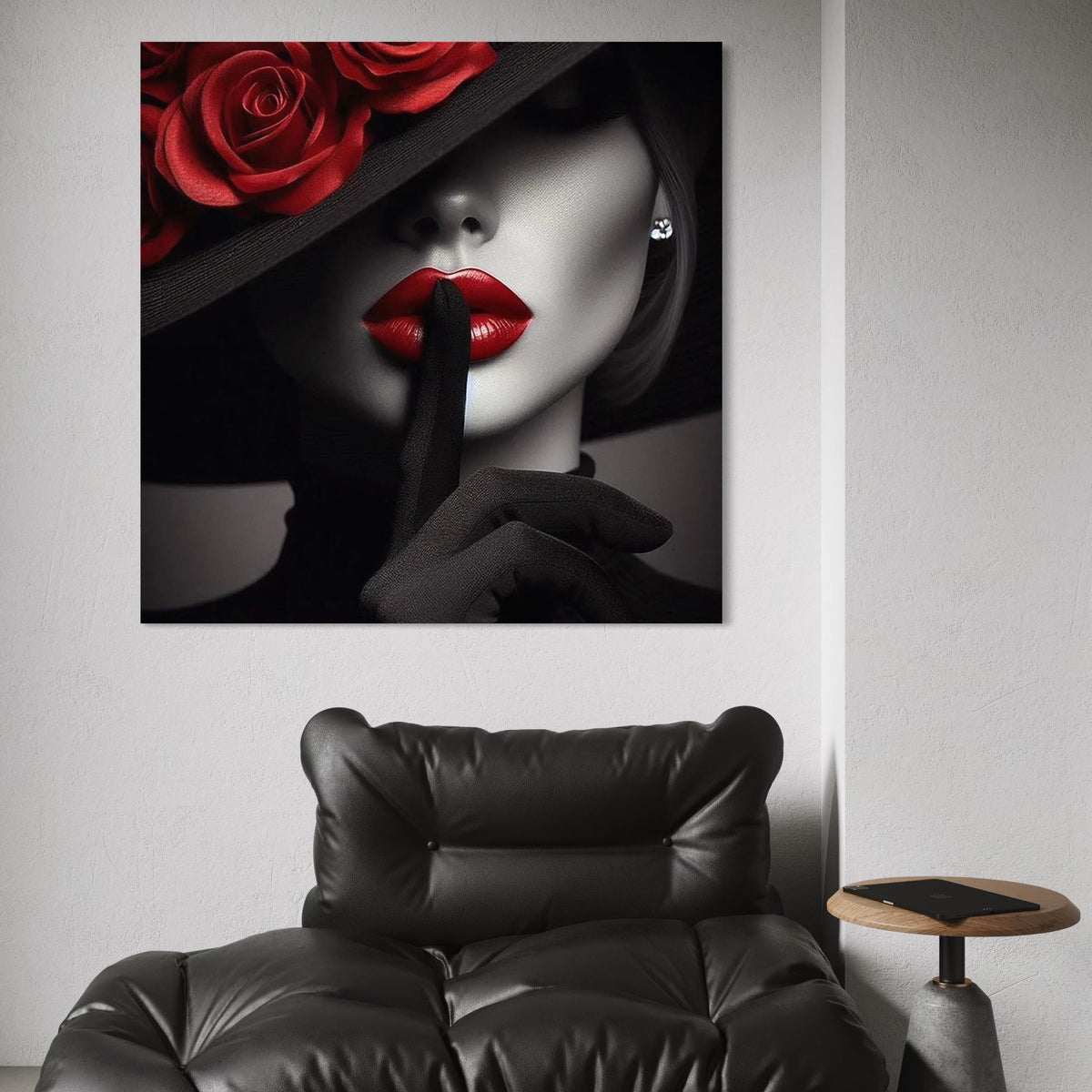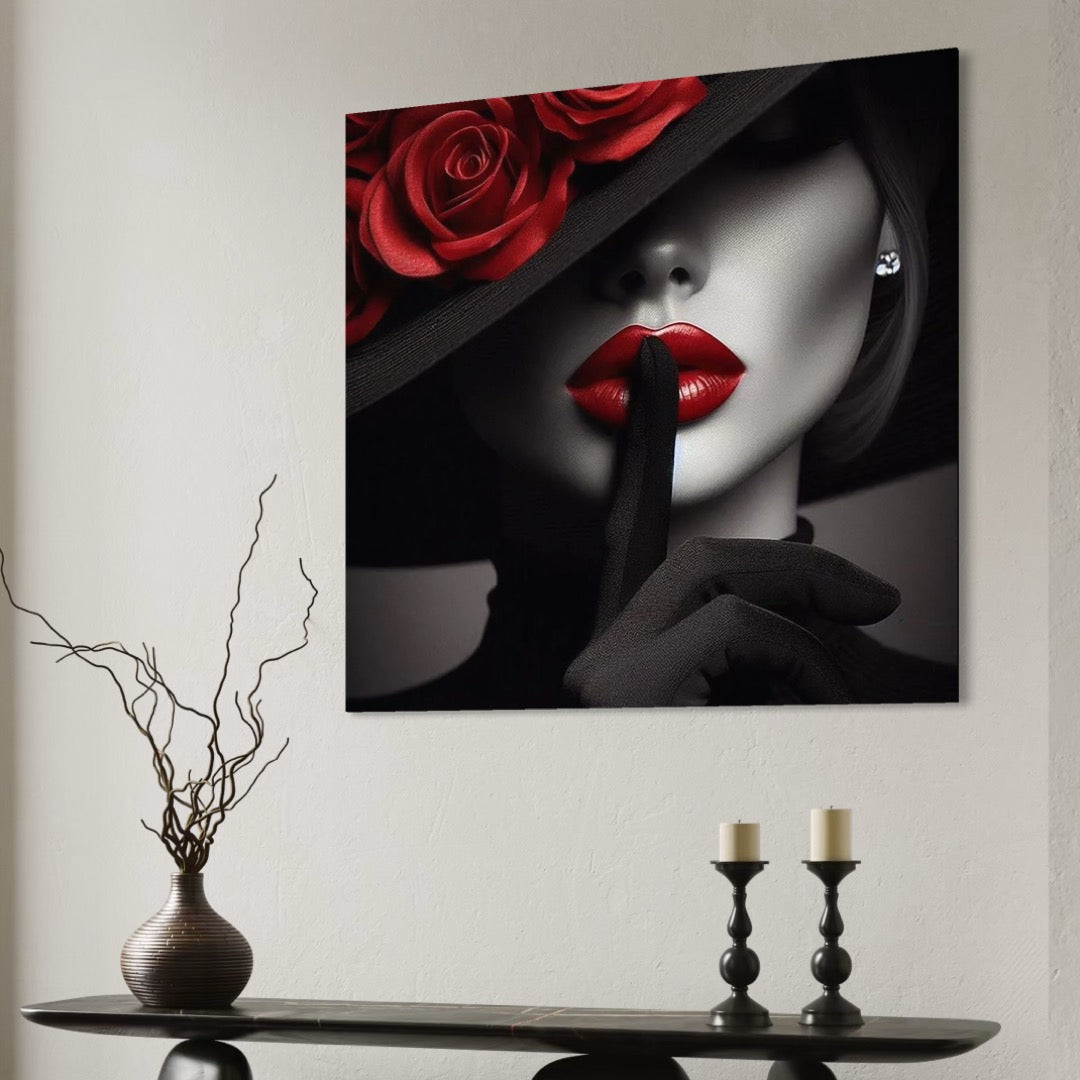 Tablou Canvas Premium, LuxCanva® P1045, Doamna cu Trandafiri, Sarut, Tacere, Palarie, Liniste, Ascultare, Diva, Senzualitate, Eclipsa, Rosu, Negru, Glamour, Living, Dormitor - 50 X 50 / Doar Sasiu Lemn / Normala