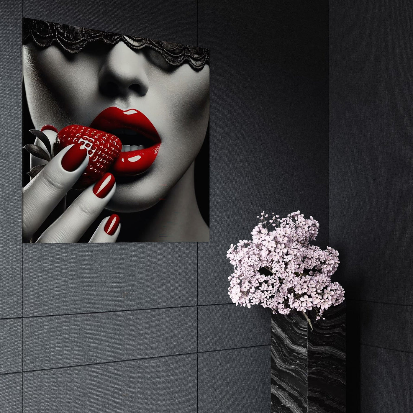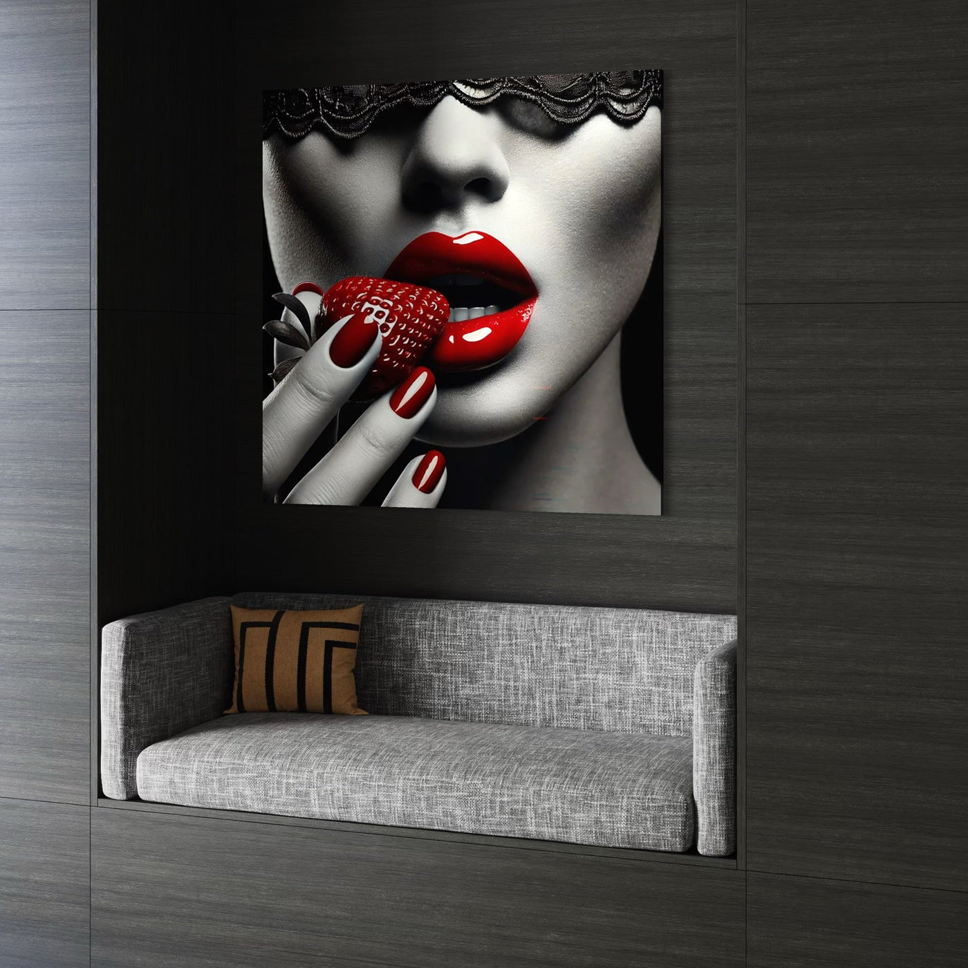 Tablou Canvas Premium, LuxCanva® P1051, Gustul Pacatului, Tentatie, Rosu, Capsuna, Gust, Interzis, Dulce, Dantela, Sarut, Alb, Negru, Tentant, Dramatic, Mister, Living, Dormitor - 50 X 50 / Doar Sasiu Lemn / Normala