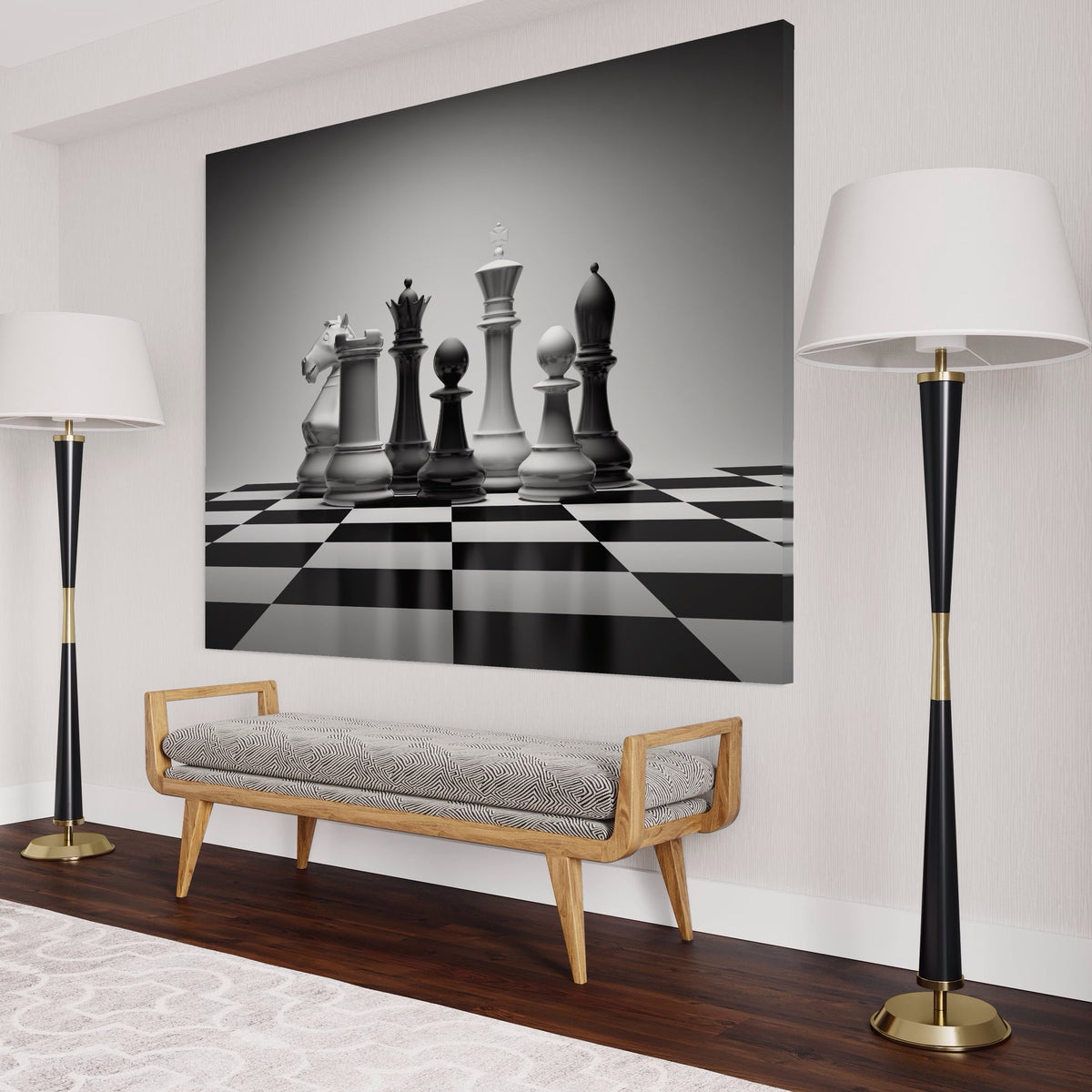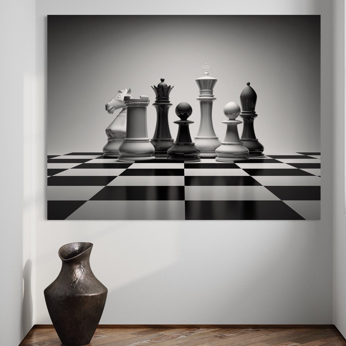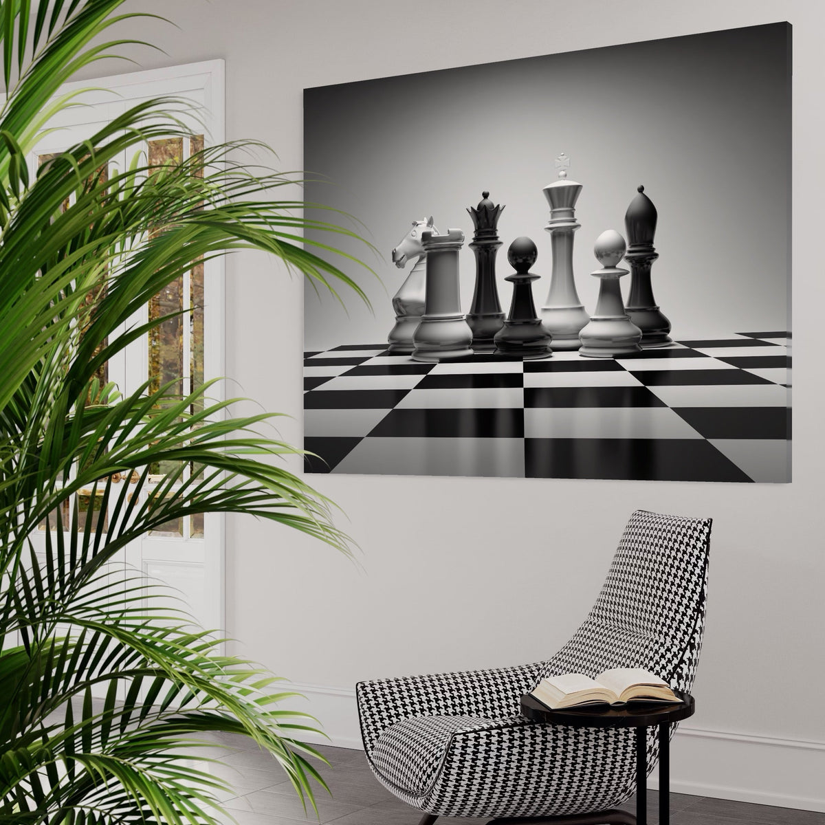 Tablou Canvas Premium LuxCanva® A1278, Tabla De Sah, Living, Piese De Sah, Regina, Rege, Birou, Alb-Negru - 45 X 60