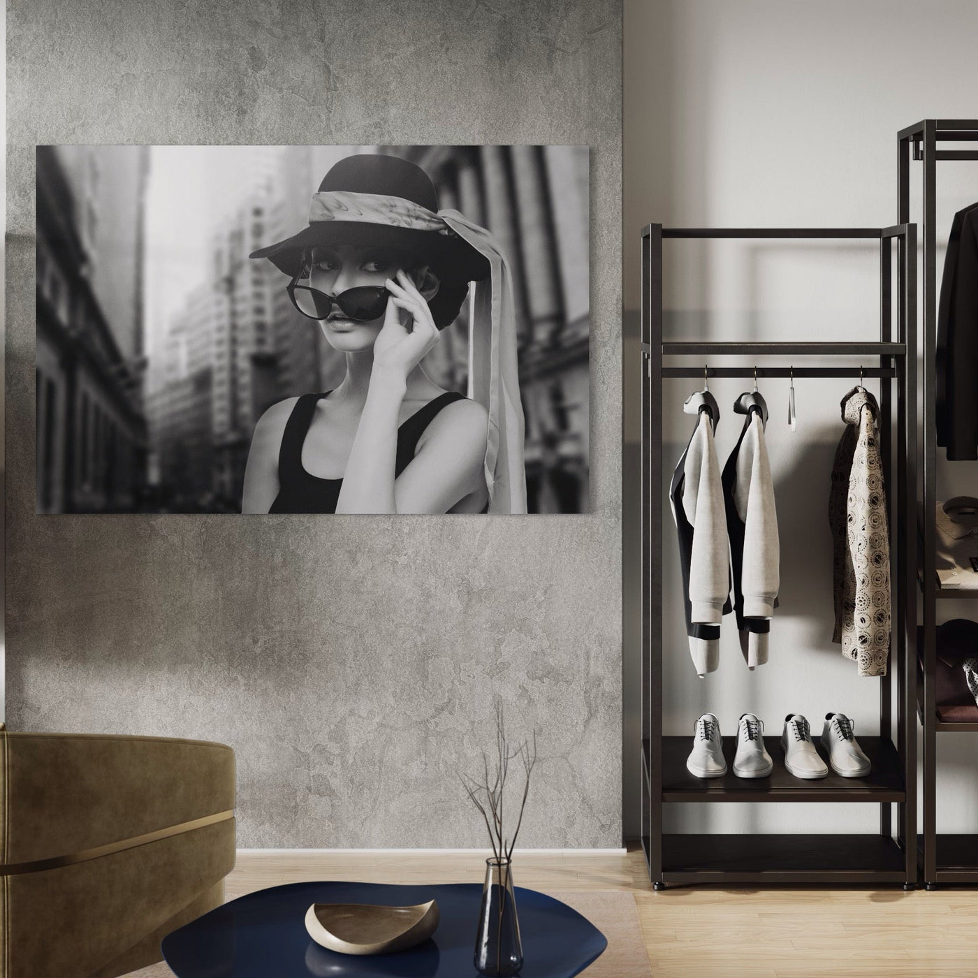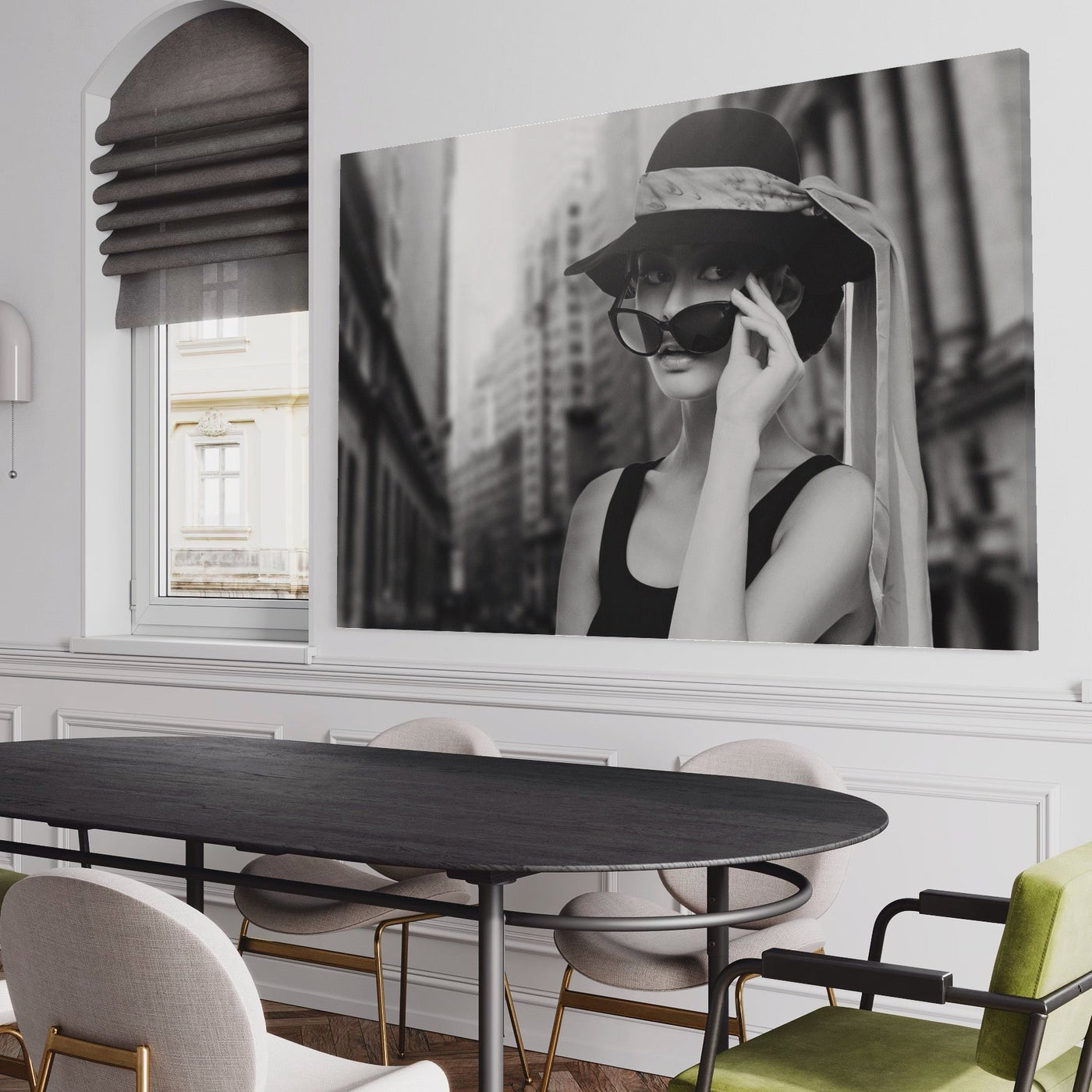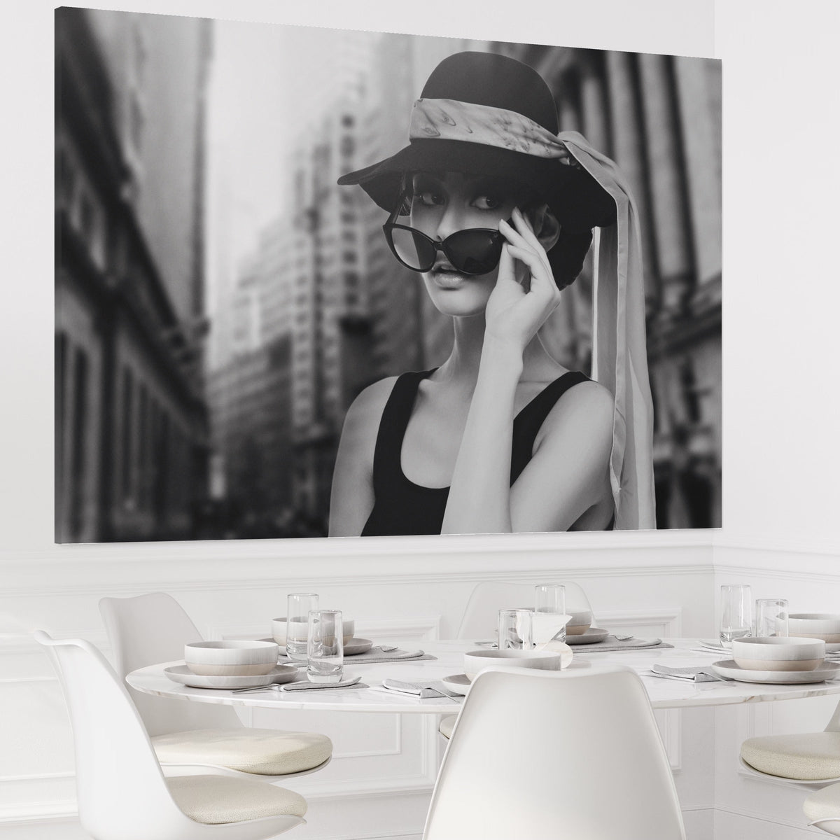 Tablou Canvas Premium LuxCanva® A1356, Beautiful Girl , Frumusete, Oras, Palarie, Ochelari, Living, Alb-Negru - 40 X 60