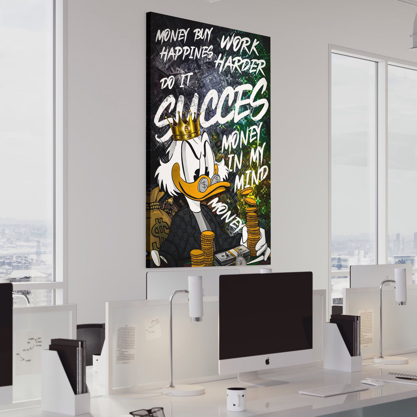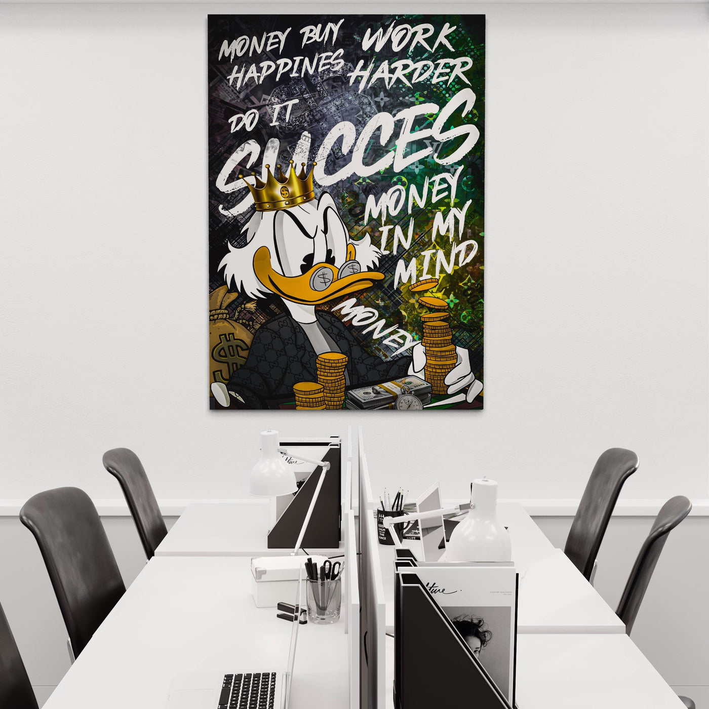 Tablou Canvas Premium LuxCanva® B1069, Work Harder , Decorativ, Birou, Donald, Bani, Succes, Dolari, Motivational, Colorat - 50 X 70
