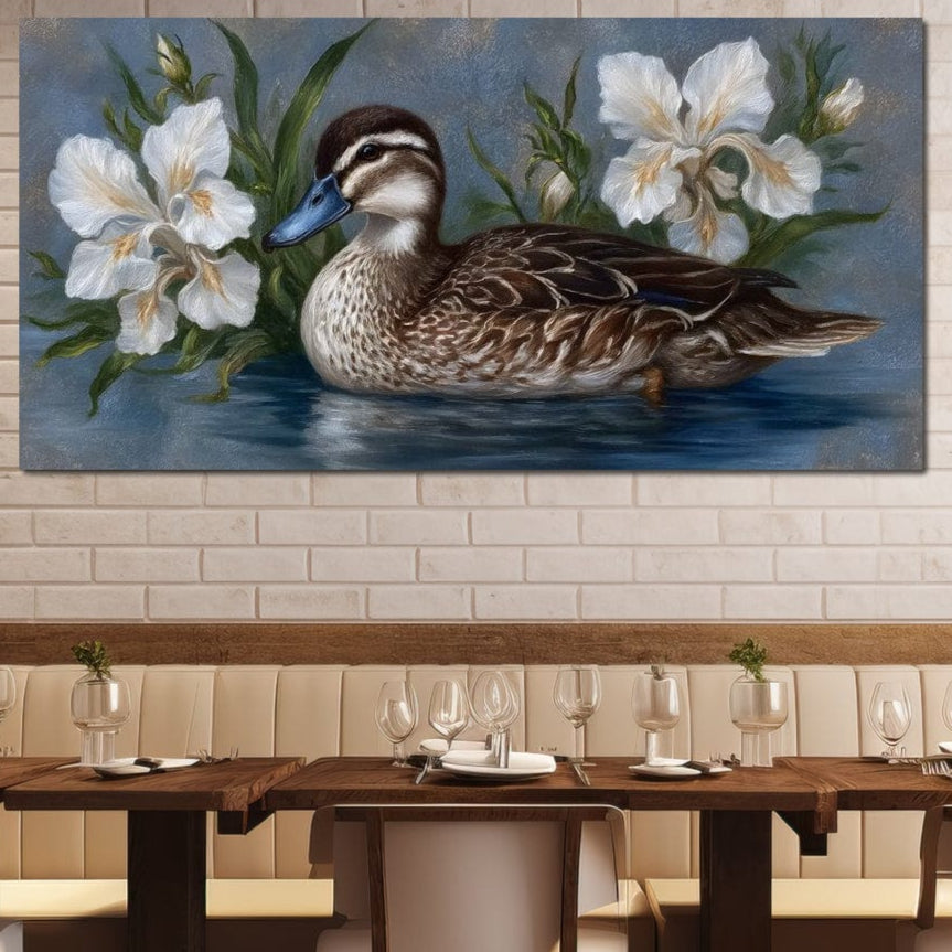 Tablou Canvas Premium, LuxCanva® M1121, Imbratisarea Crinilor, Rata, Apa, Crini, Flori, Pasare, Frunzis, Lac, Delta, Pictura, Liniste, Relaxare, Birou, Living, Camera Copil
