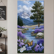 Tablou Canvas Premium, LuxCanva® M1156, Calatorie in Valea Mov, Munte, Peisaj, Flori, Vegetatie, Natura, Rau, Lavanda, Fluture, Copaci, Pastel, Primavara, Birou, Living, Camera Copil - 40 X 80