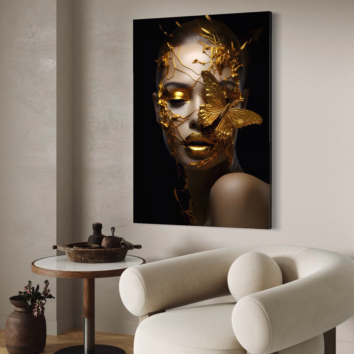 Tablou Canvas Premium LuxCanva® A1425, Gold Butterfly , Living, Frumusete, Femeie, Fluturi, Auriu, Decorativ, Culori Vibrante