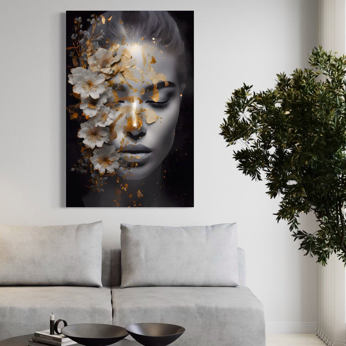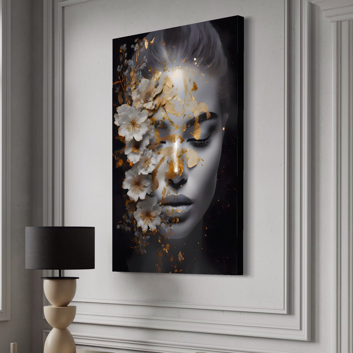 Tablou Canvas Premium LuxCanva® A1428, Face With Flowers , Dormitor, Femeie, Flori, Auriu, Decorativ, Living, Culori Vibrante - 45 X 70