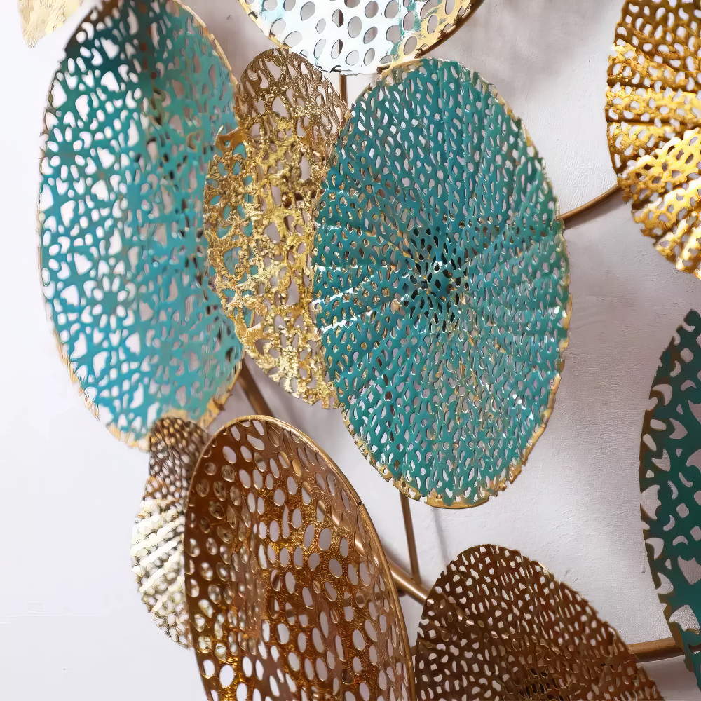 Decoratiune Metalica de Perete LuxCanva® OpalCircles A0921, din Metal, Rotunda, Auriu, Verde, Dimensiune Mare 84 × 73 x 3 cm