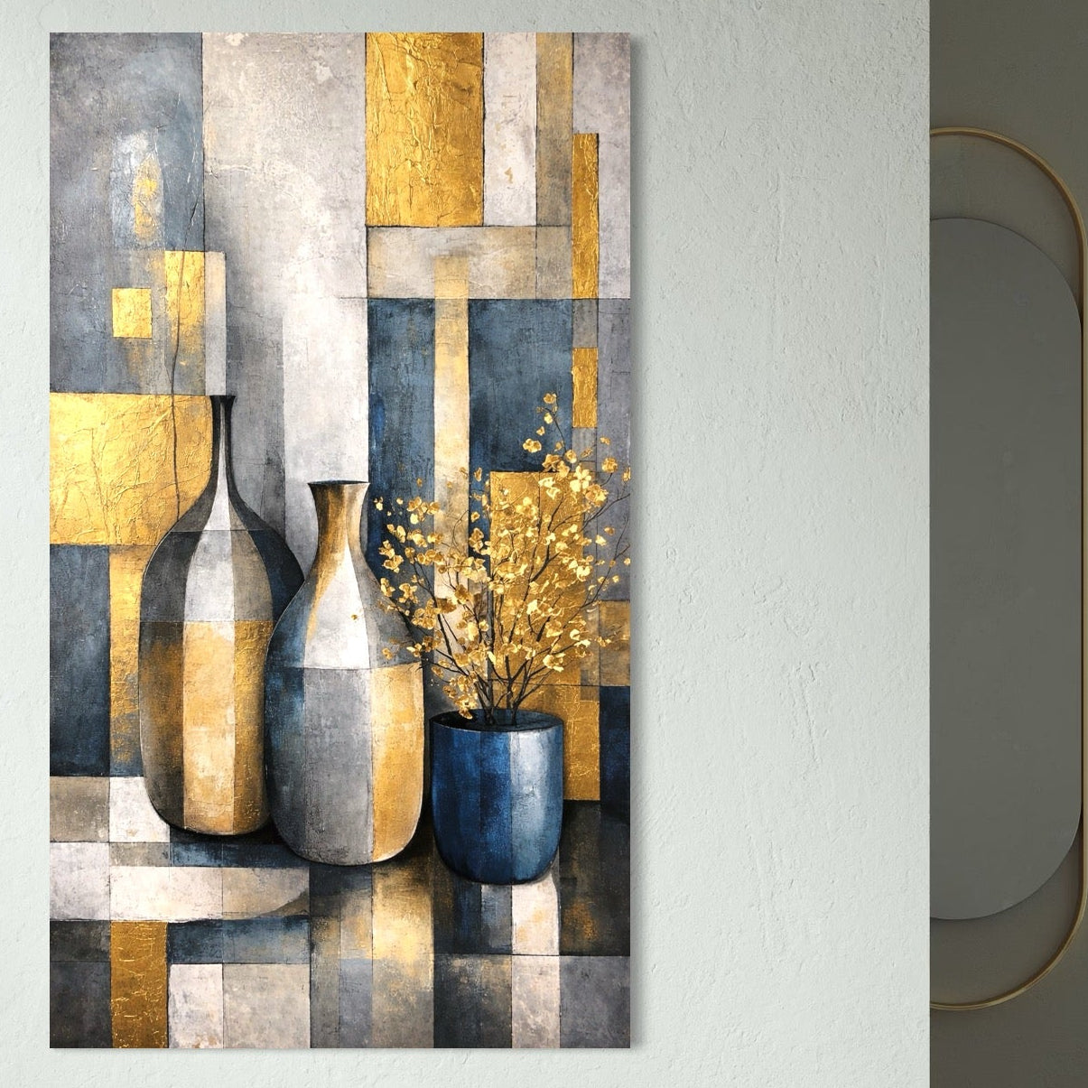 Tablou Canvas Premium, LuxCanva® C1284, Obiecte care asculta, Geometrie, Culori, Abstract, Foita, Auriu, Sofisticat, Obiecte, Forma, Ceramica, Natura, Statica, Expozitie, Birou, Living, Dormitor - 40 X 70