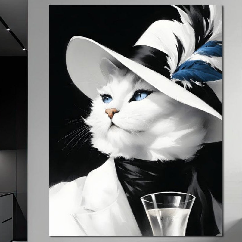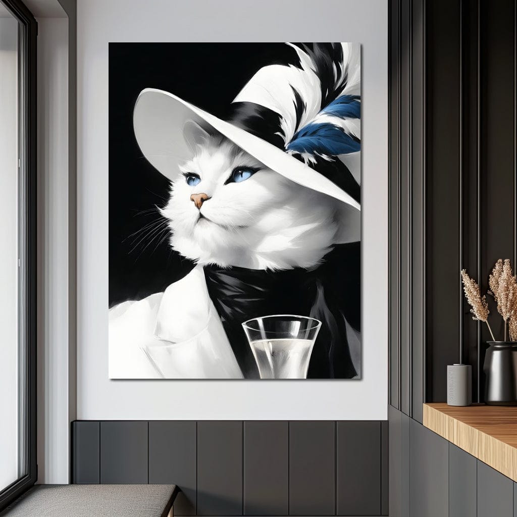 Tablou Canvas Premium, LuxCanva® M1202, Sampanie si Carisma,Palarie, Pene, Pahar, Sampanie, Pisica, Lux, Elegant, Felina, Aristocrat, Fashion, Diva, Glamour, Birou, Living, Camera Copil - 45 X 60