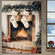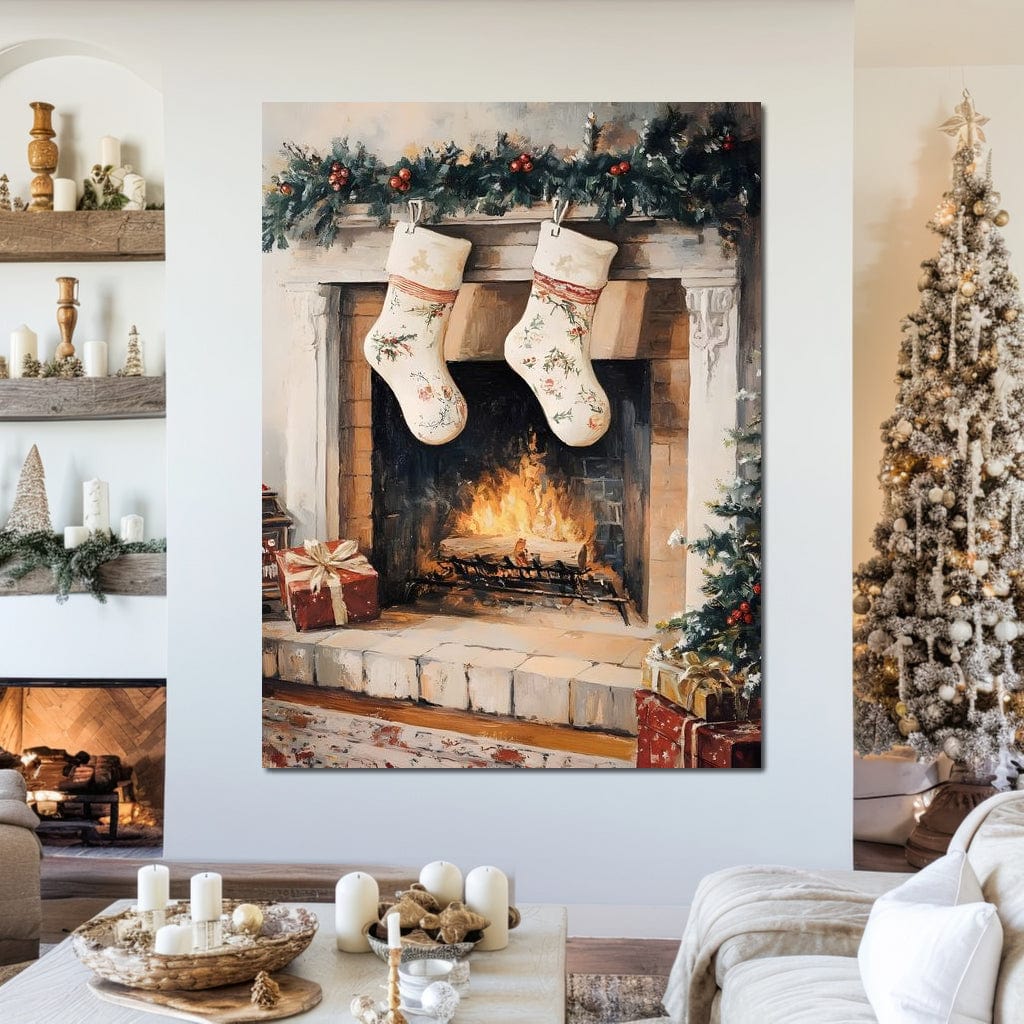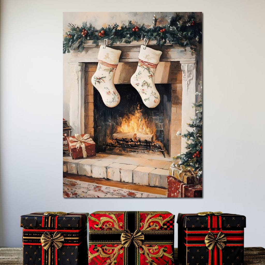 Tablou Canvas Premium, LuxCanva® D1062, Ciorapii Mosului, Iarna, Semineu, Aprins, Foc, Lemne, Ghirlanda, Brad, Magie, Mos Craciun, Visare, Familie, Ajun, Asteptare, Camera Copil, Living, Dormitor - 45 X 60 / Doar Sasiu Lemn / Normala