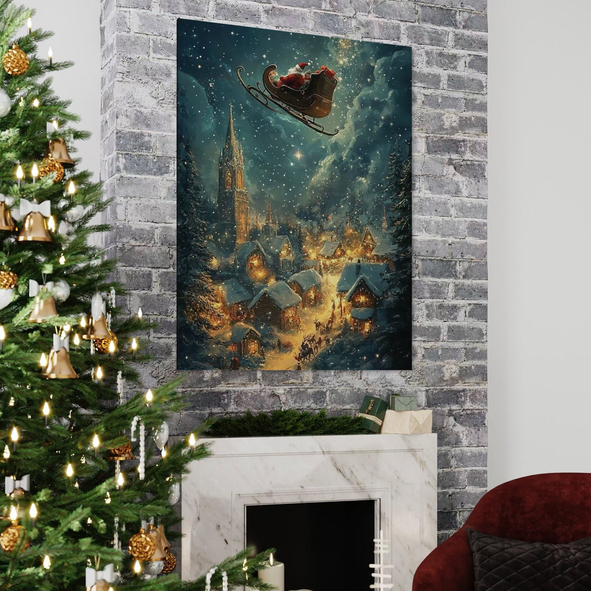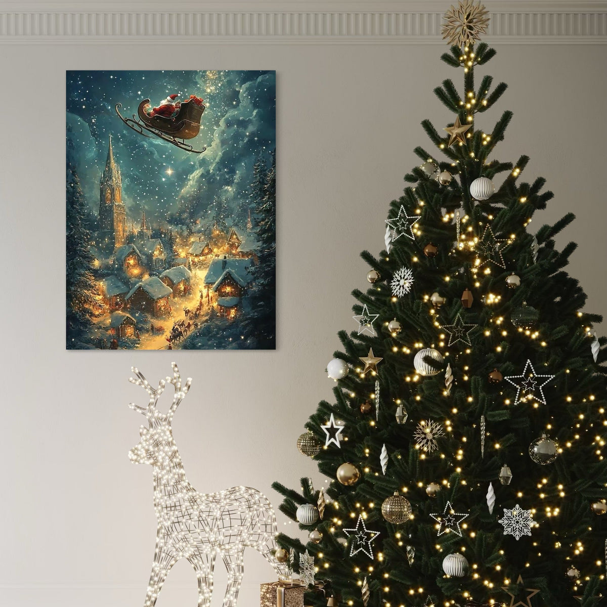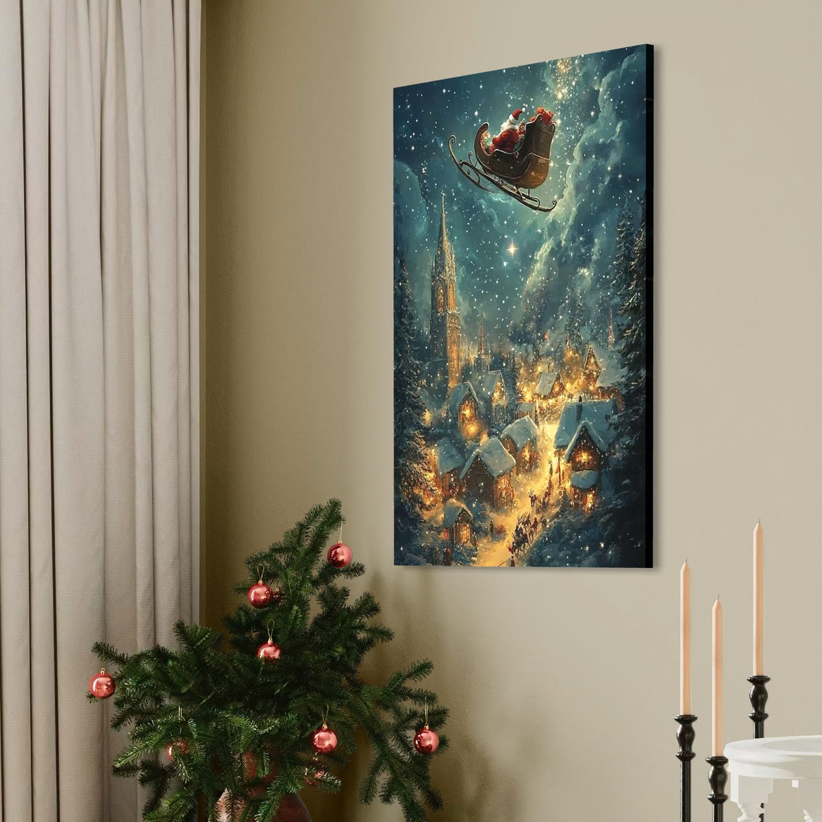 Tablou Canvas Premium, LuxCanva® D1101, Zborul din Ajunul Craciunului, Vis, Speranta, Cer, Instelat, Sanie, Reni, Desaga, Cadouri, Jucarii, Oras, Calatorie, Somn, Dimineata, Ajun, Living, Dormitor - 45 X 60 / Doar Sasiu Lemn / Normala