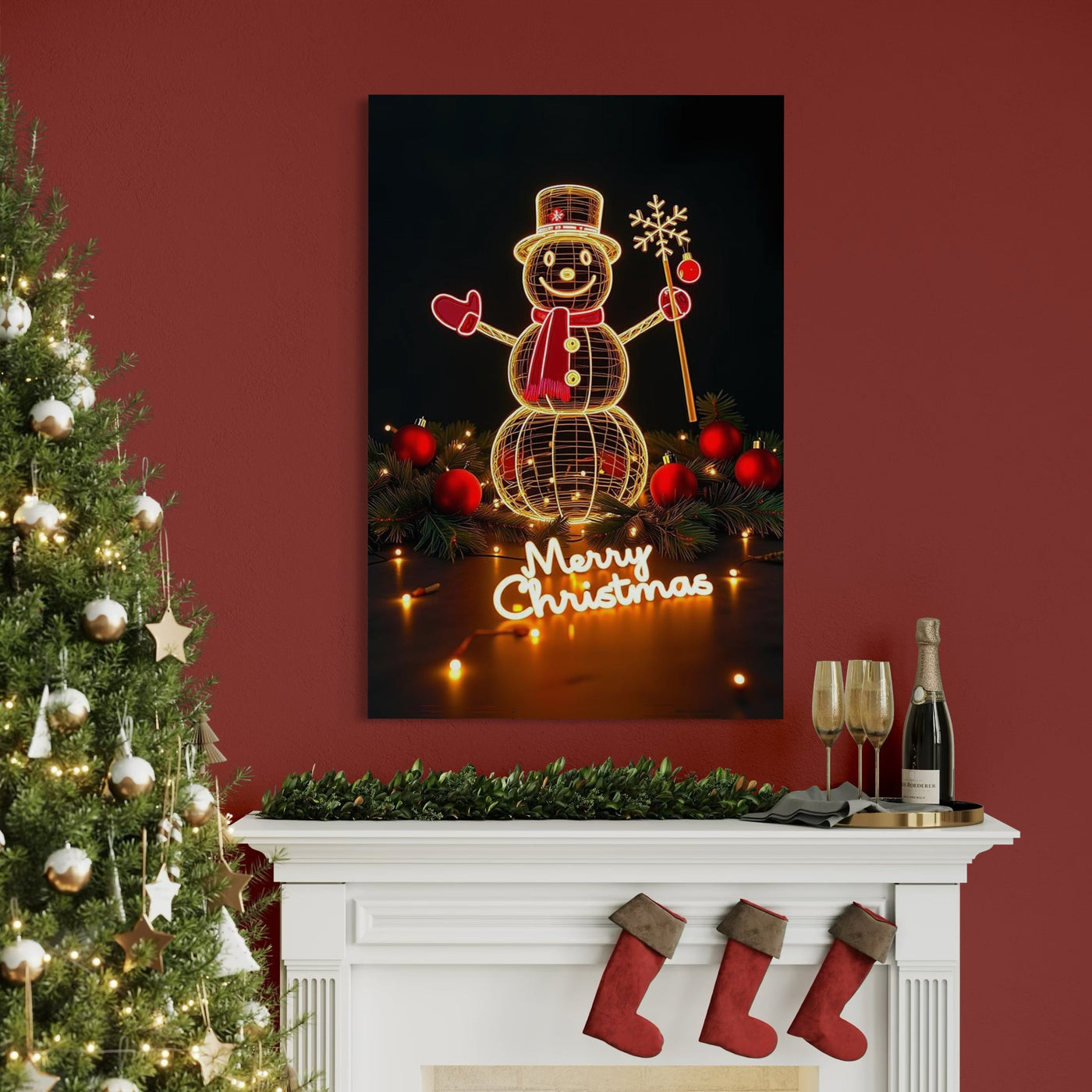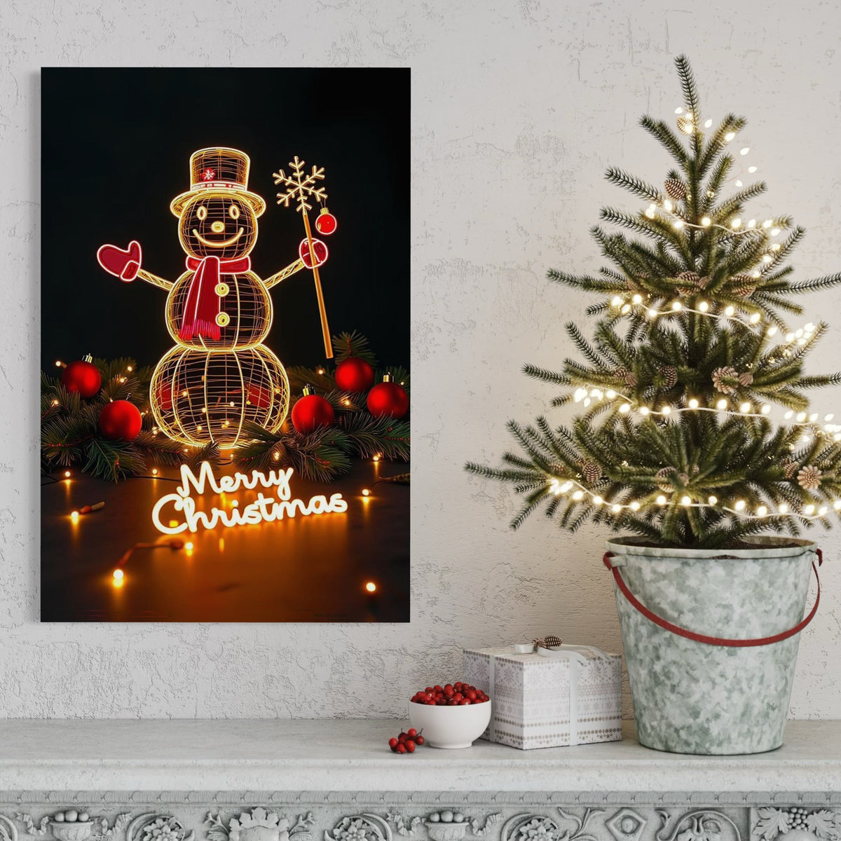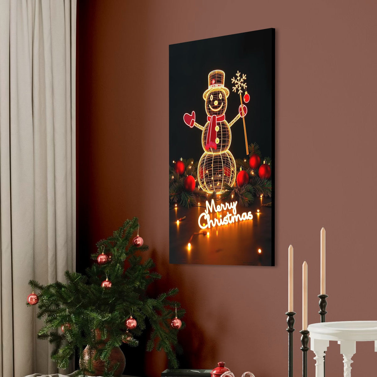 Tablou Canvas Premium, LuxCanva® D1105, Feerie de Sarbatoare, Lumini, Craciun, Om de Zapada, Globuri, Rosii, Beteala, Luminite, Sarbatori, Plimbare, Strada, Parc, Copii, Living, Dormitor